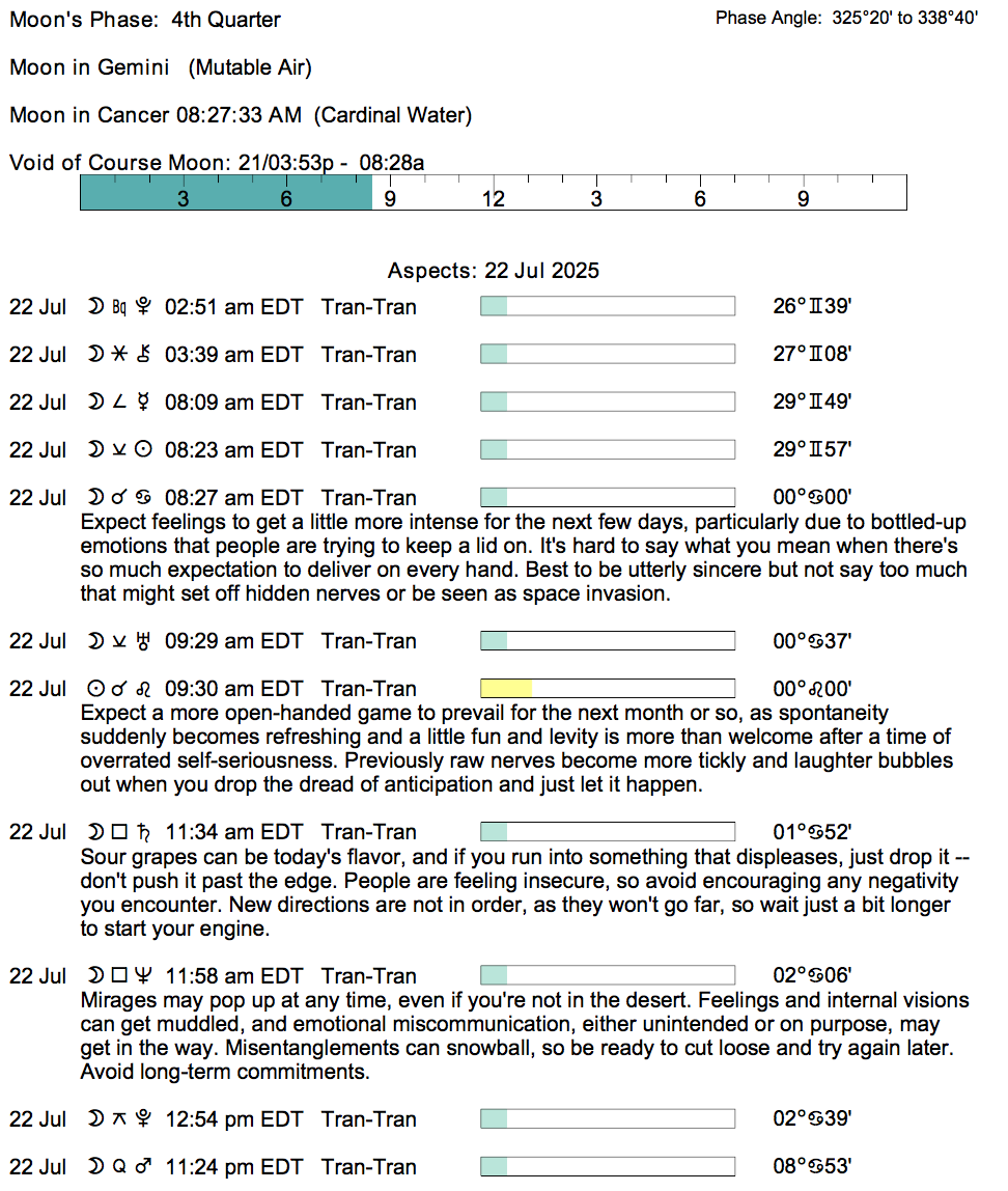- A void Moon period continues until 8:25 AM today (since yesterday at 3:51 PM).