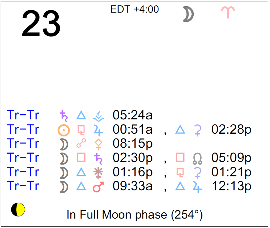 Planet Color Key: The longer the bar, the slower the aspecting planet and the longer the duration of the planet’s transit.