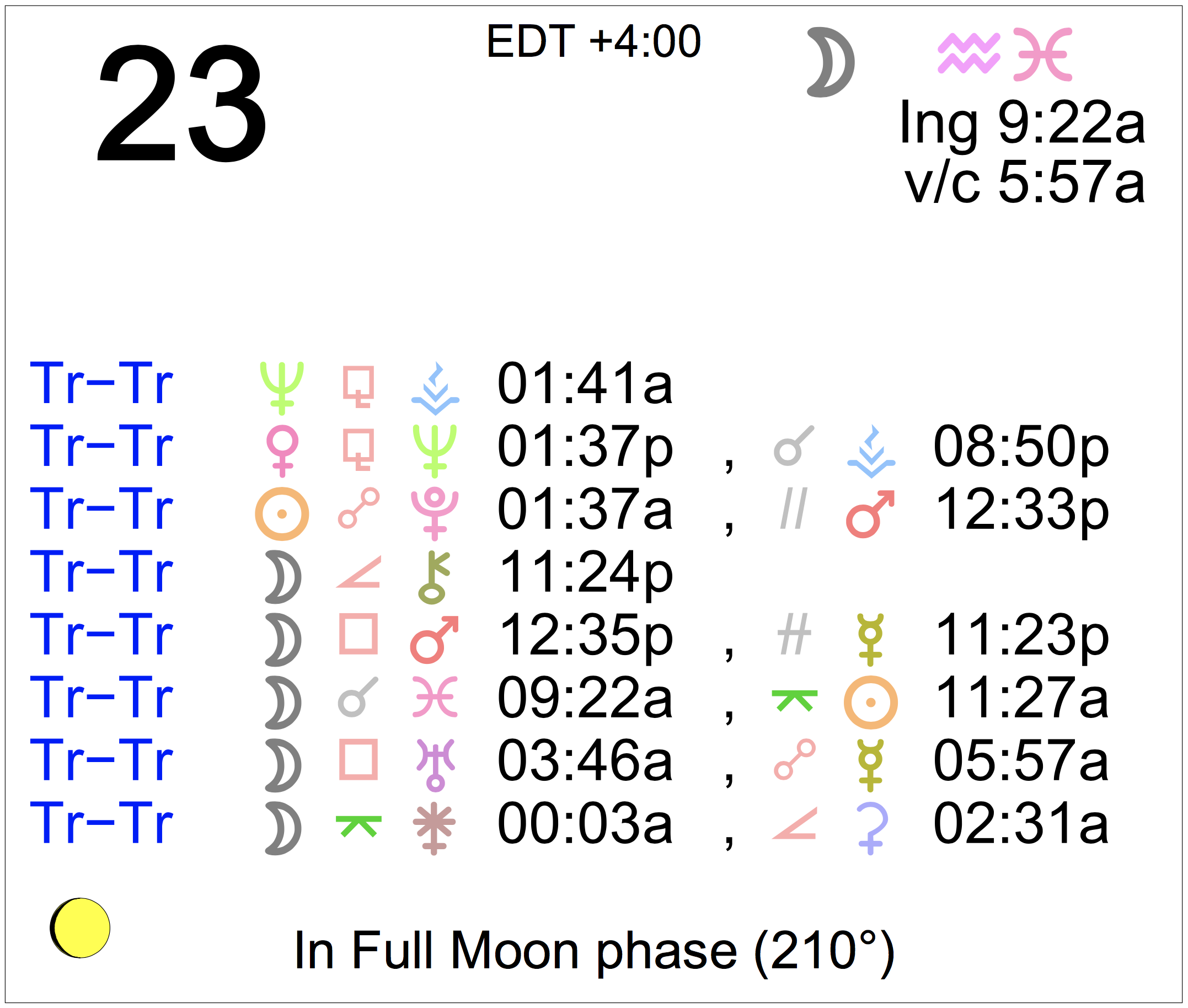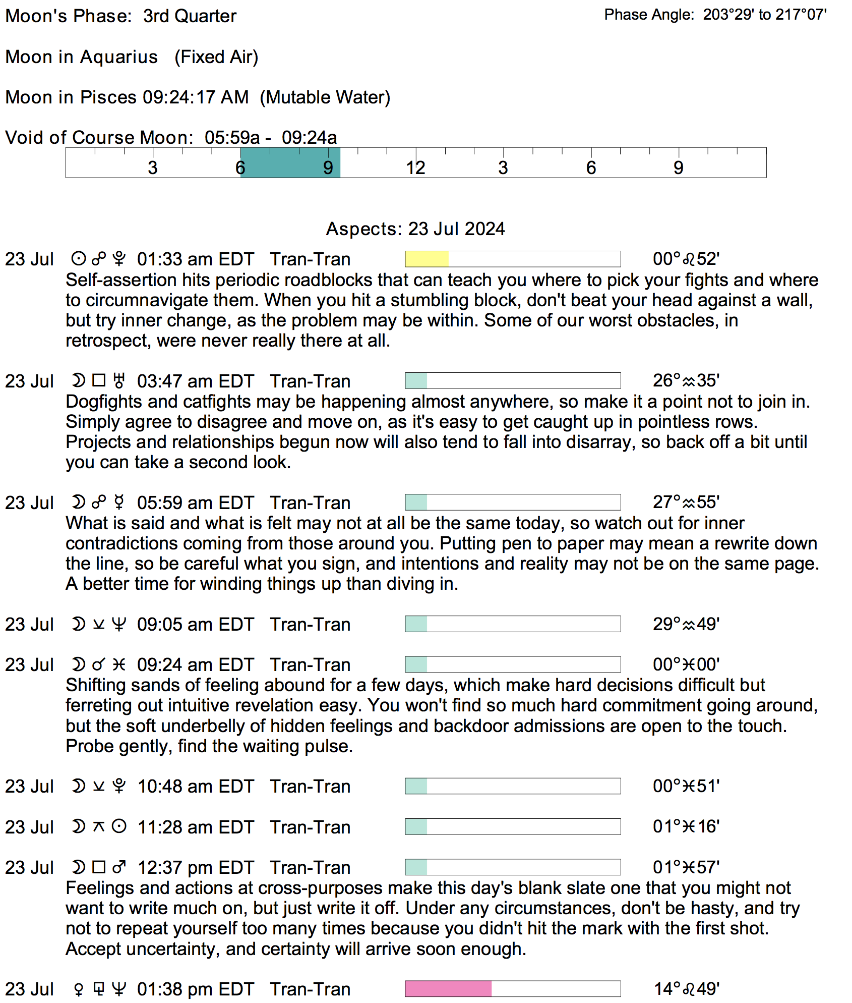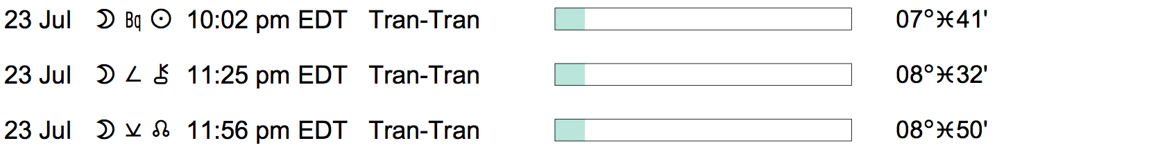 Planet Color Key: The longer the bar, the slower the aspecting planet, and the longer the duration of the planet’s transit.