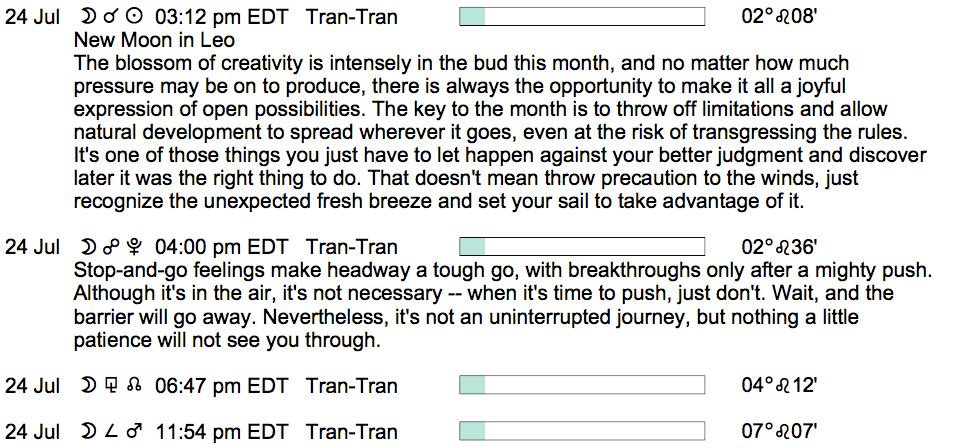Planet Color Key: The longer the bar, the slower the aspecting planet, and the longer the duration of the planet’s transit.