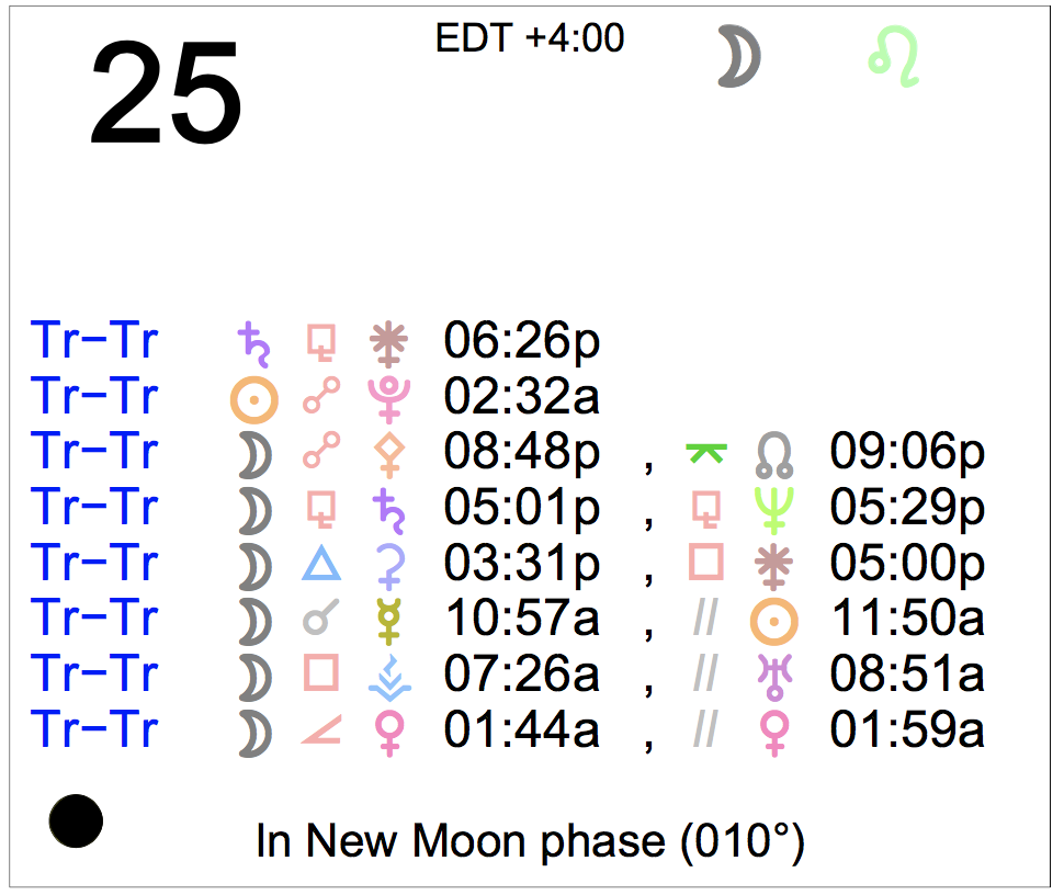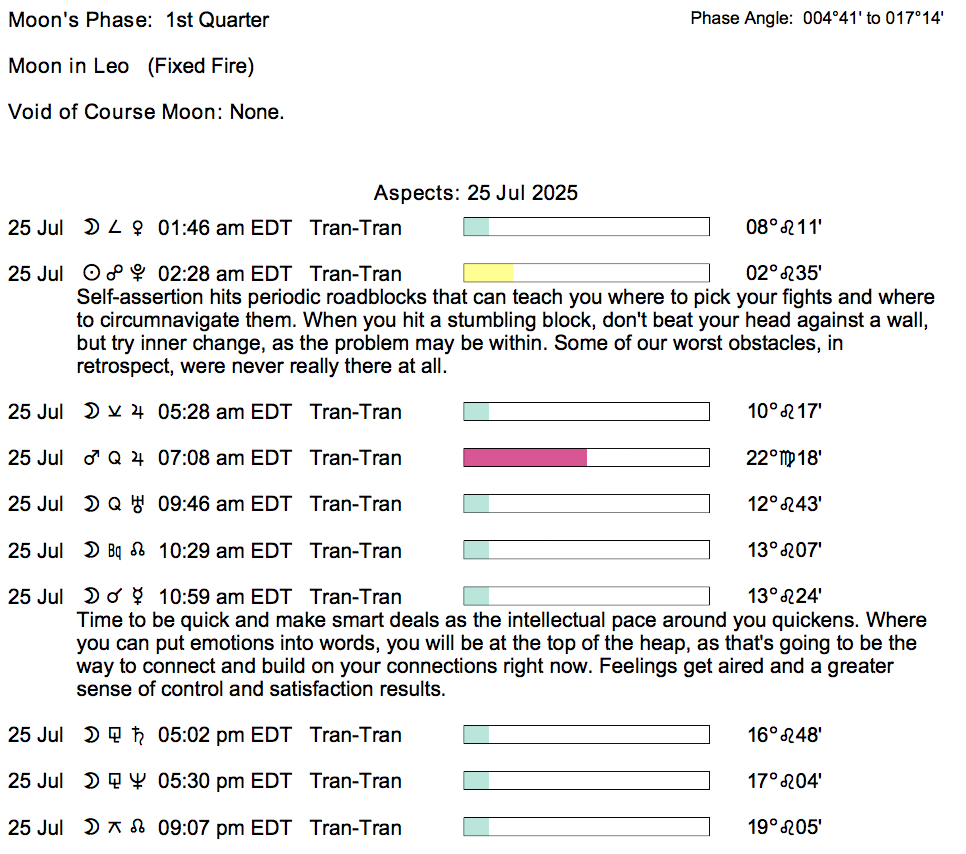Planet Color Key: The longer the bar, the slower the aspecting planet, and the longer the duration of the planet’s transit.
