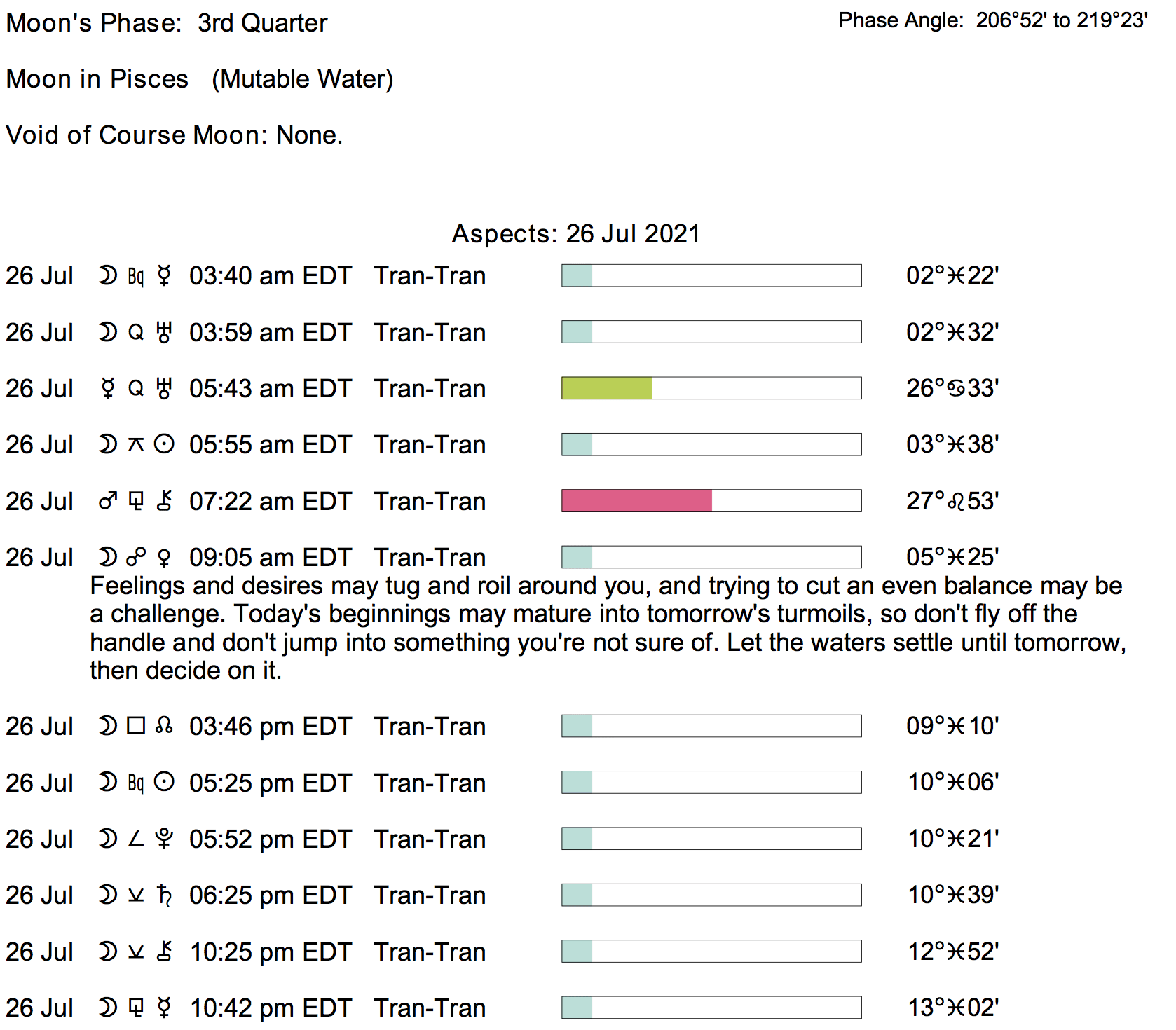Planet Color Key: The longer the bar, the slower the aspecting planet, and the longer the duration of the planet’s transit.