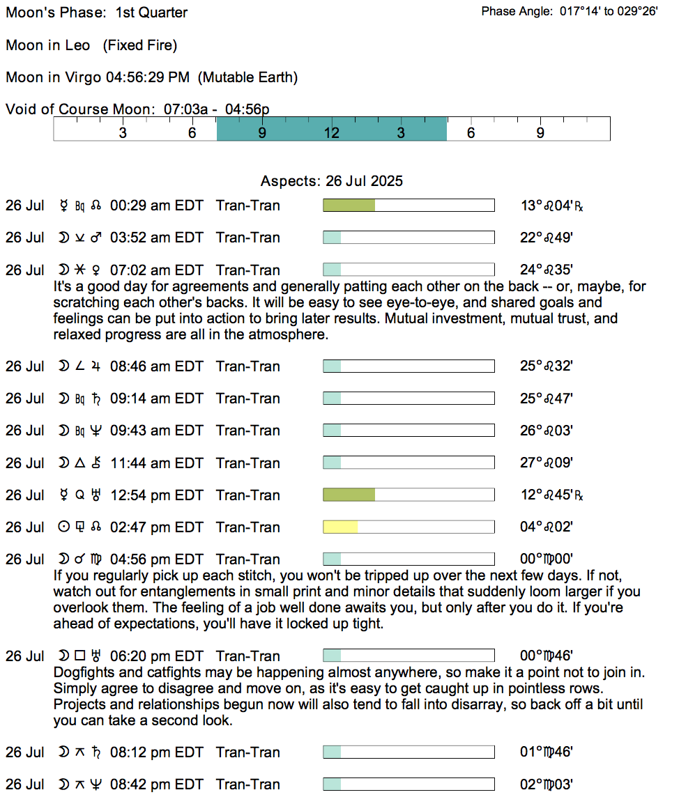 Planet Color Key: The longer the bar, the slower the aspecting planet, and the longer the duration of the planet’s transit.