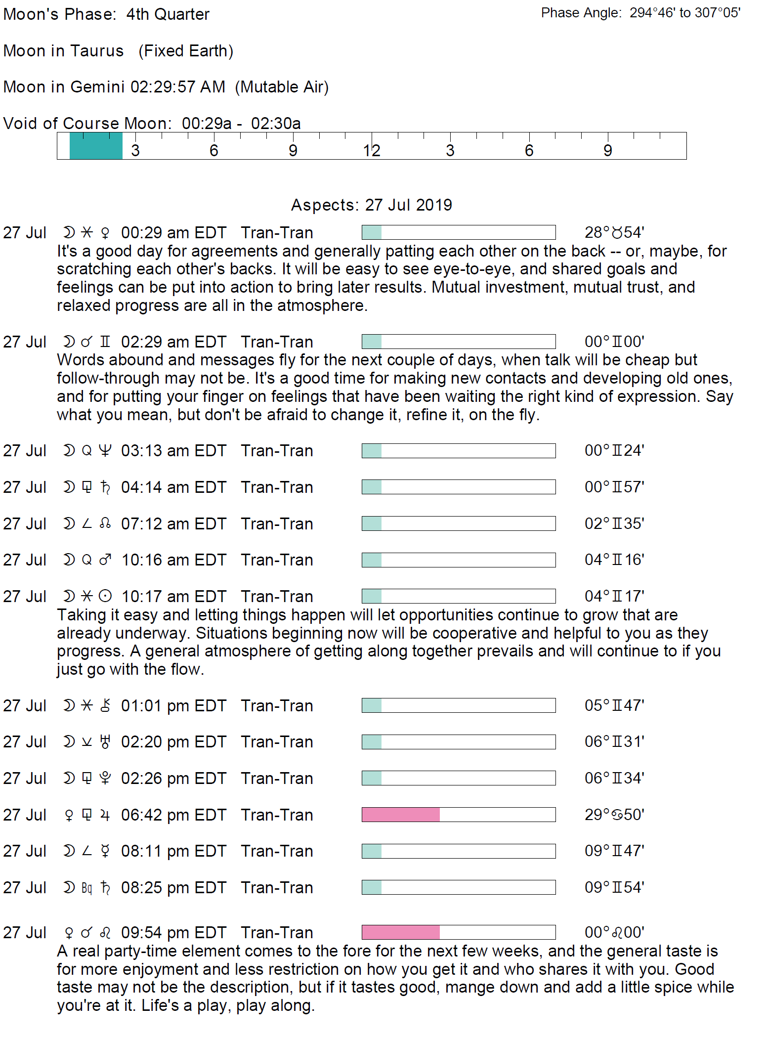 Planet Color Key: The longer the bar, the slower the aspecting planet and the longer the duration of the planet’s transit.