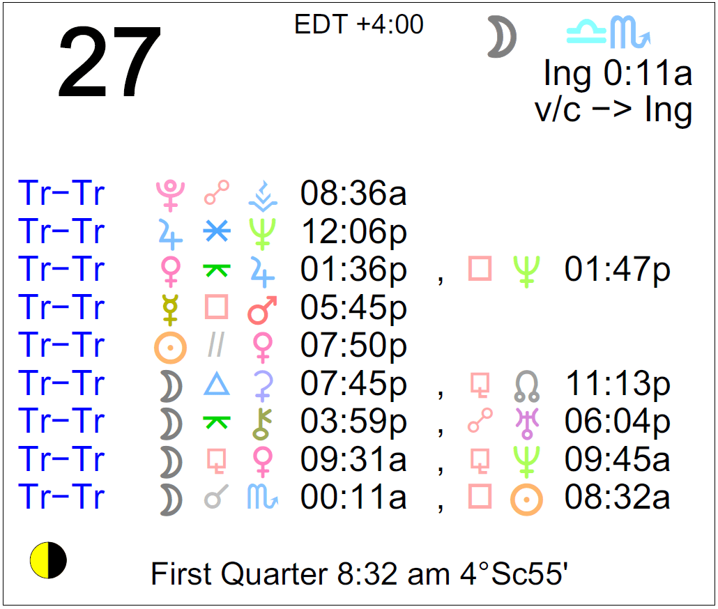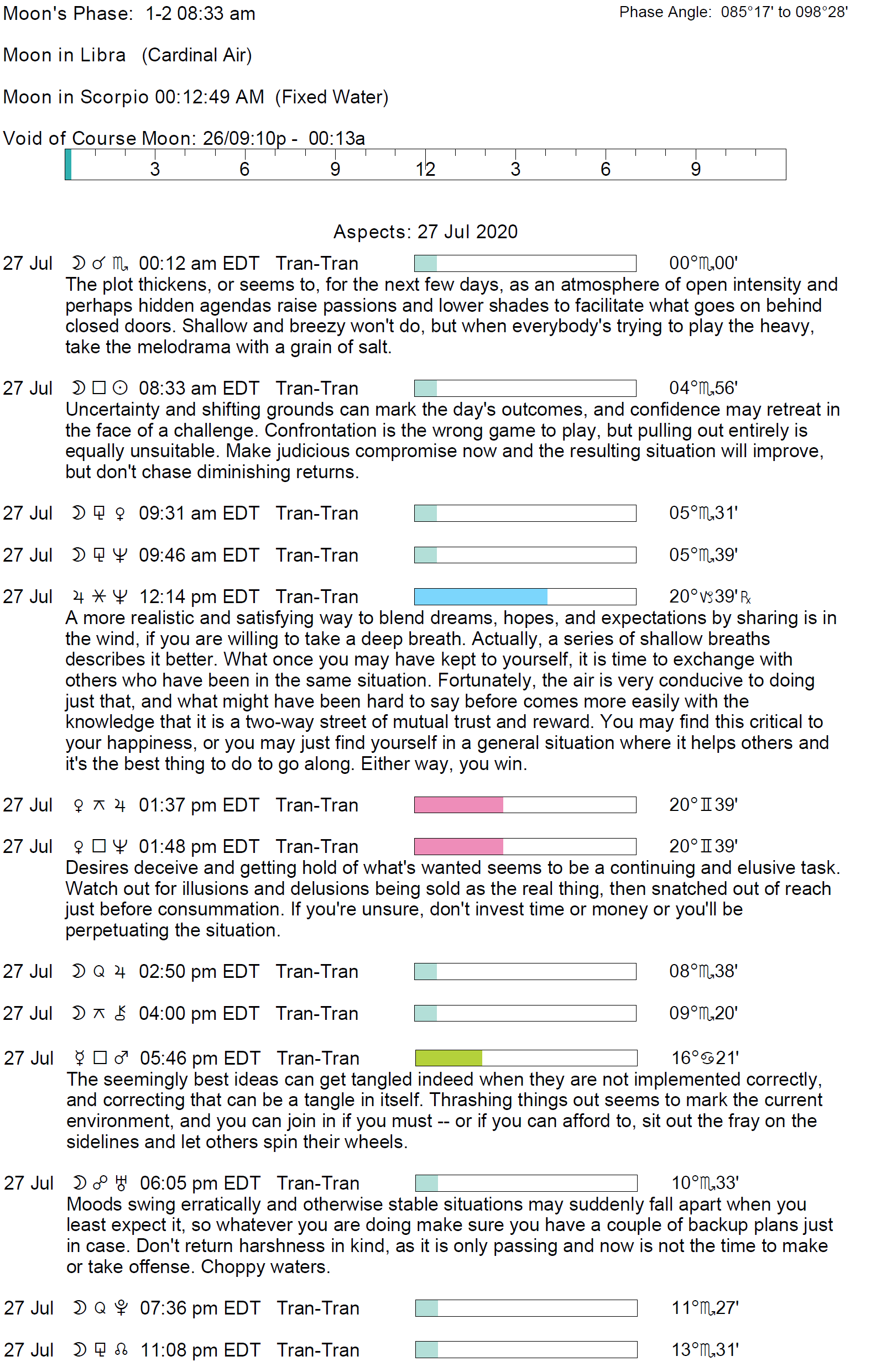Planet Color Key: The longer the bar, the slower the aspecting planet and the longer the duration of the planet’s transit.