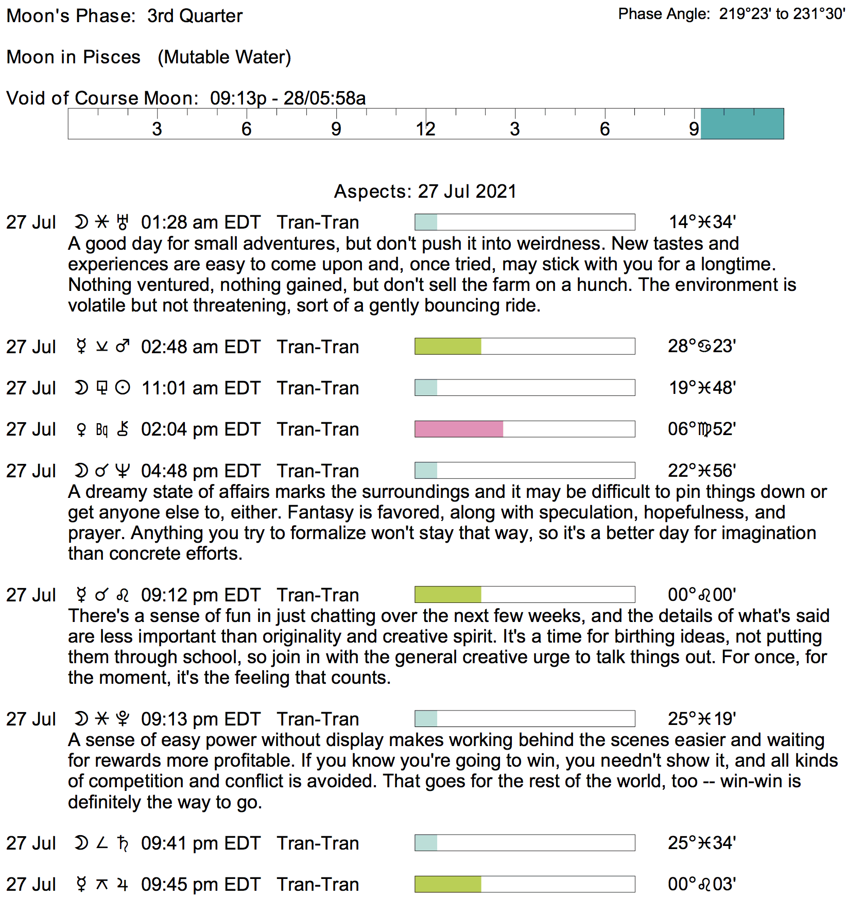 Planet Color Key: The longer the bar, the slower the aspecting planet, and the longer the duration of the planet’s transit.