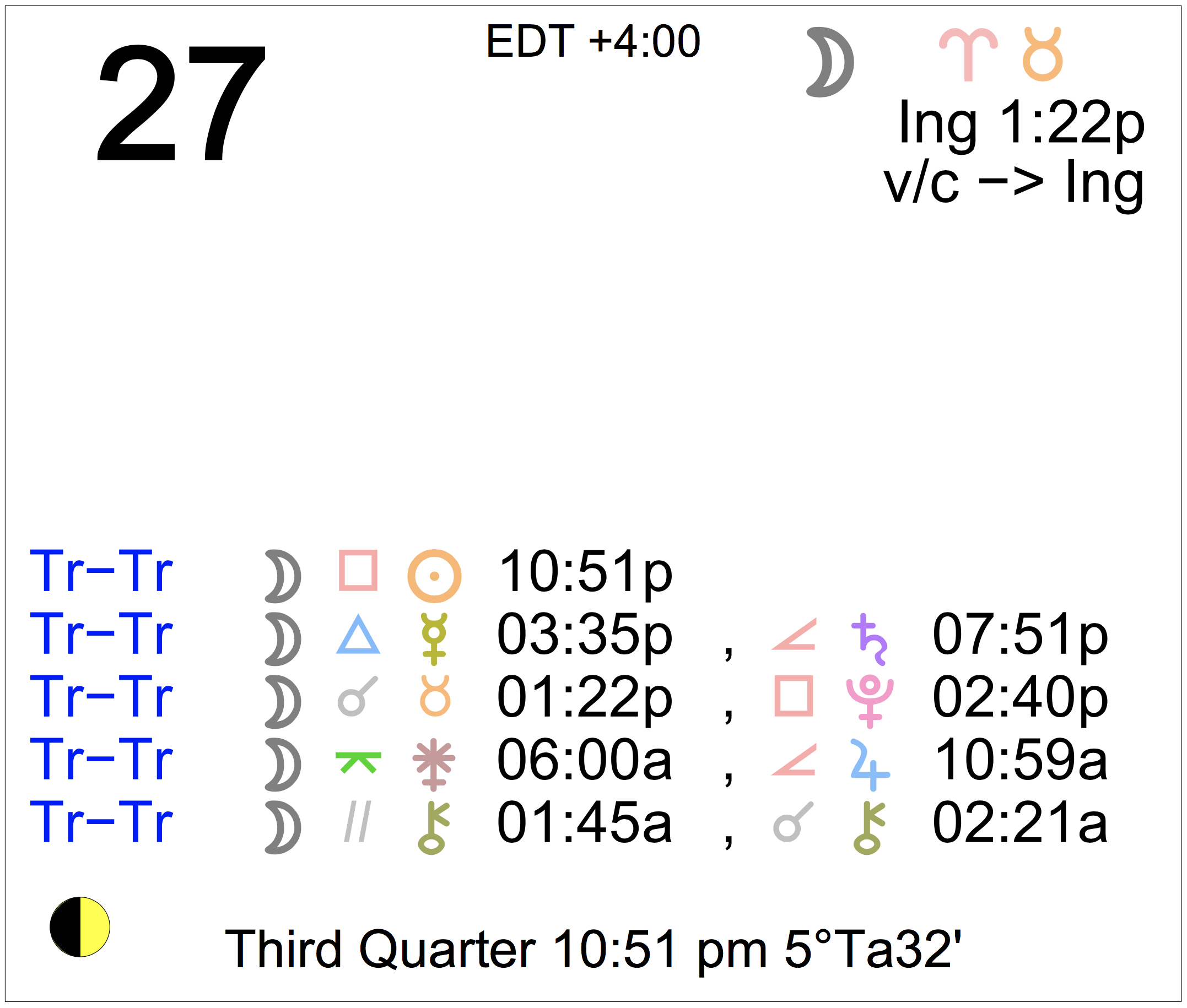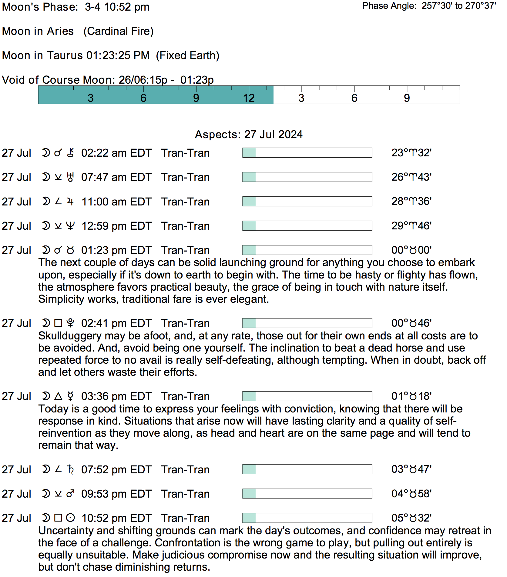 Planet Color Key: The longer the bar, the slower the aspecting planet, and the longer the duration of the planet’s transit.