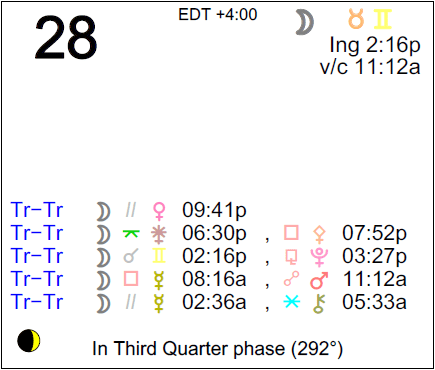 The following aspects (major only) and positions are at noon (EDT) on July 28th: