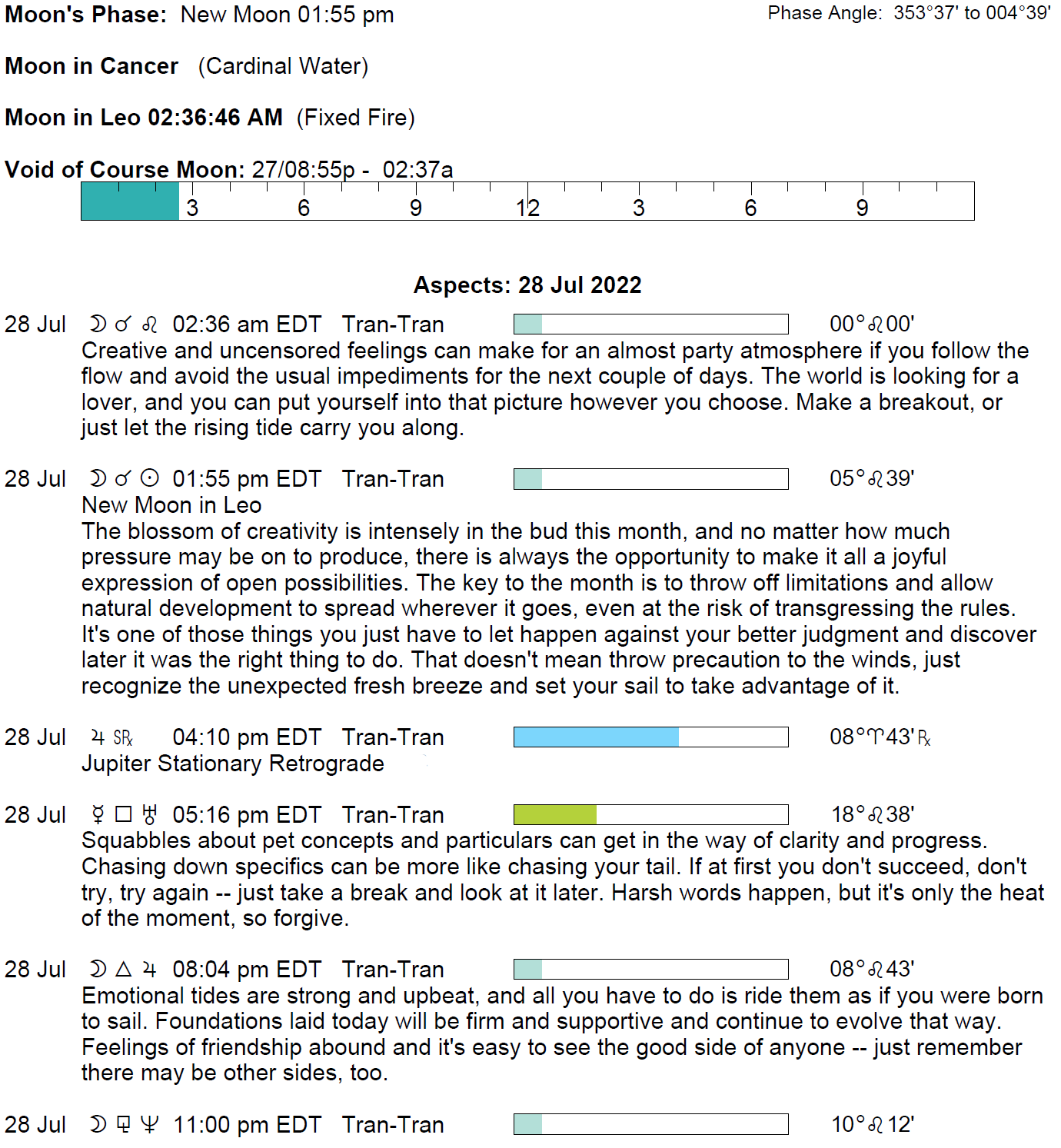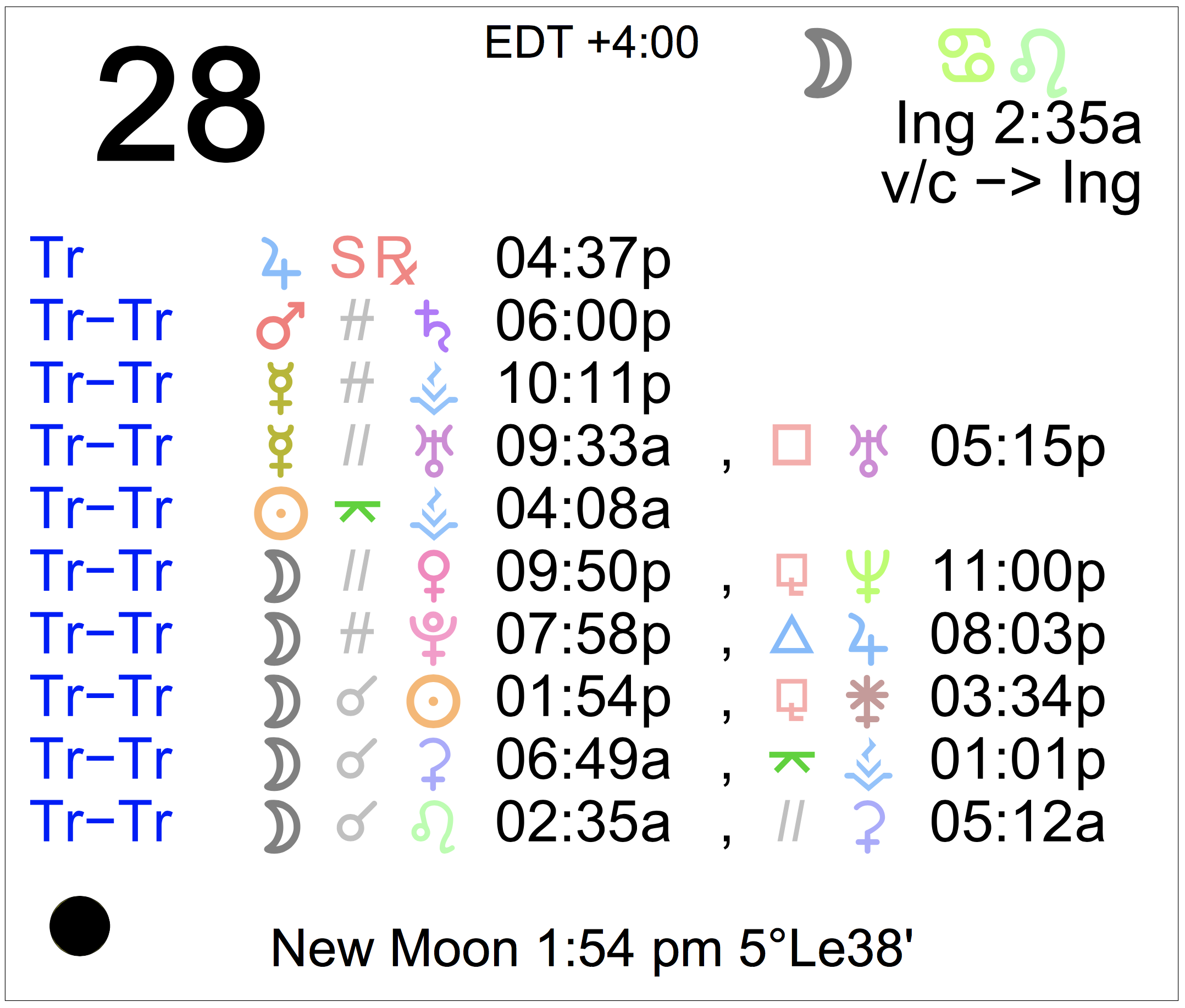 - The New Moon occurs today in the sign of Leo at 1:54 PM.