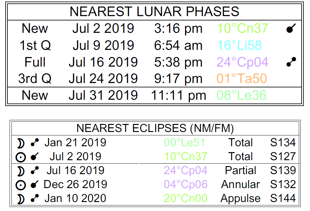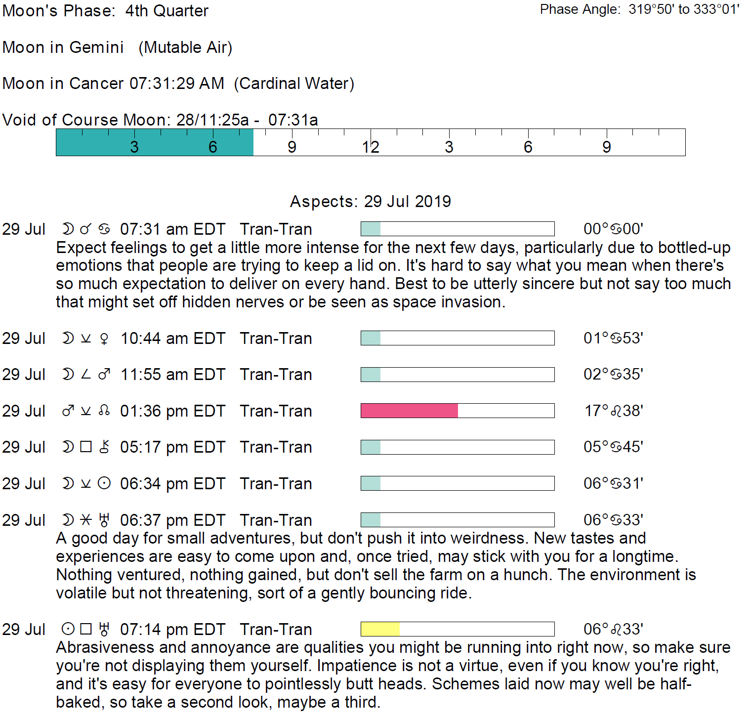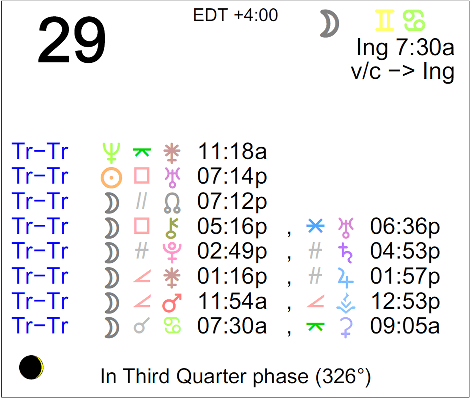 Planet Color Key: The longer the bar, the slower the aspecting planet and the longer the duration of the planet’s transit.