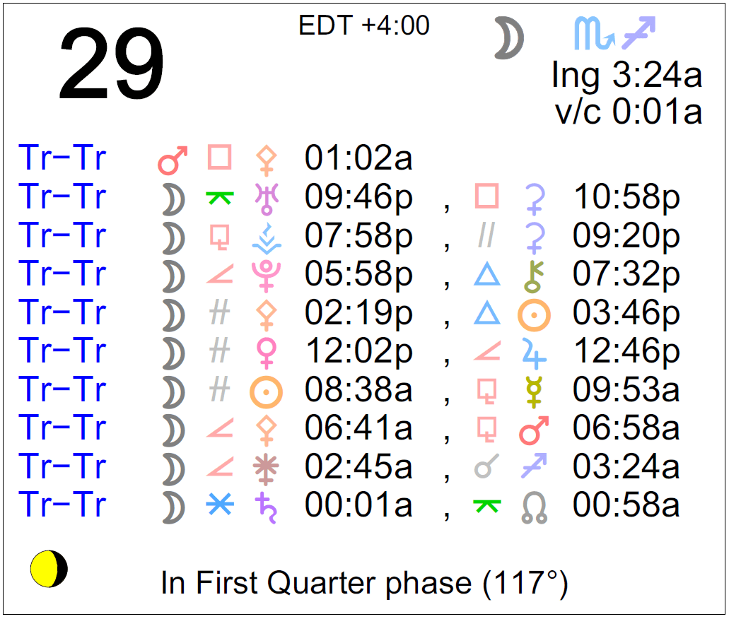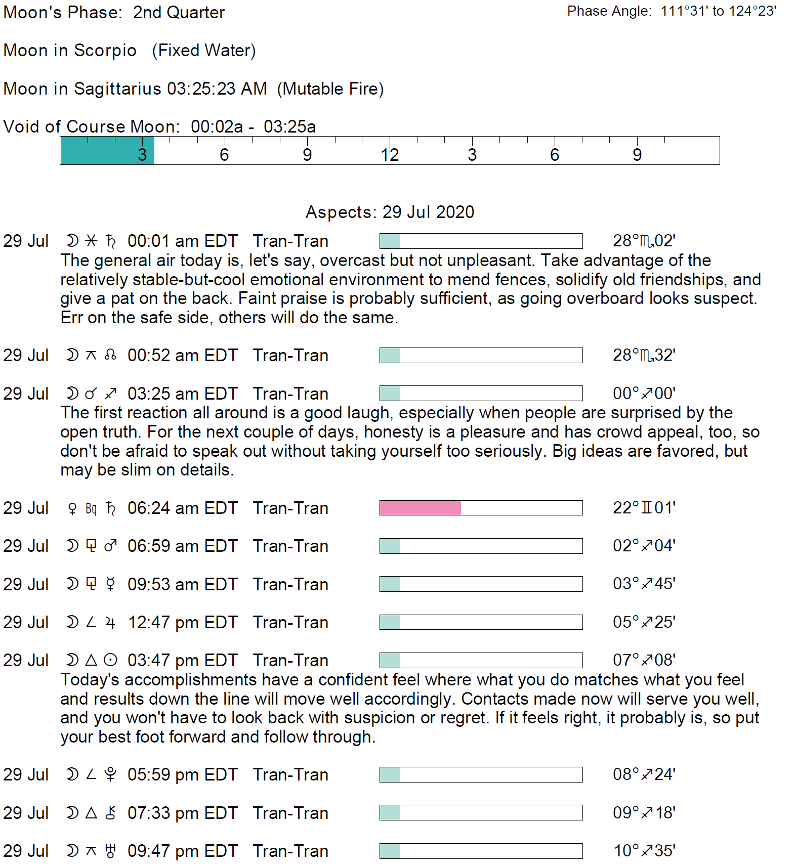 Planet Color Key: The longer the bar, the slower the aspecting planet and the longer the duration of the planet’s transit.