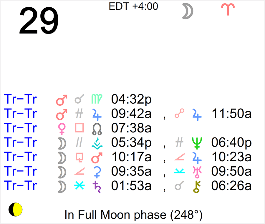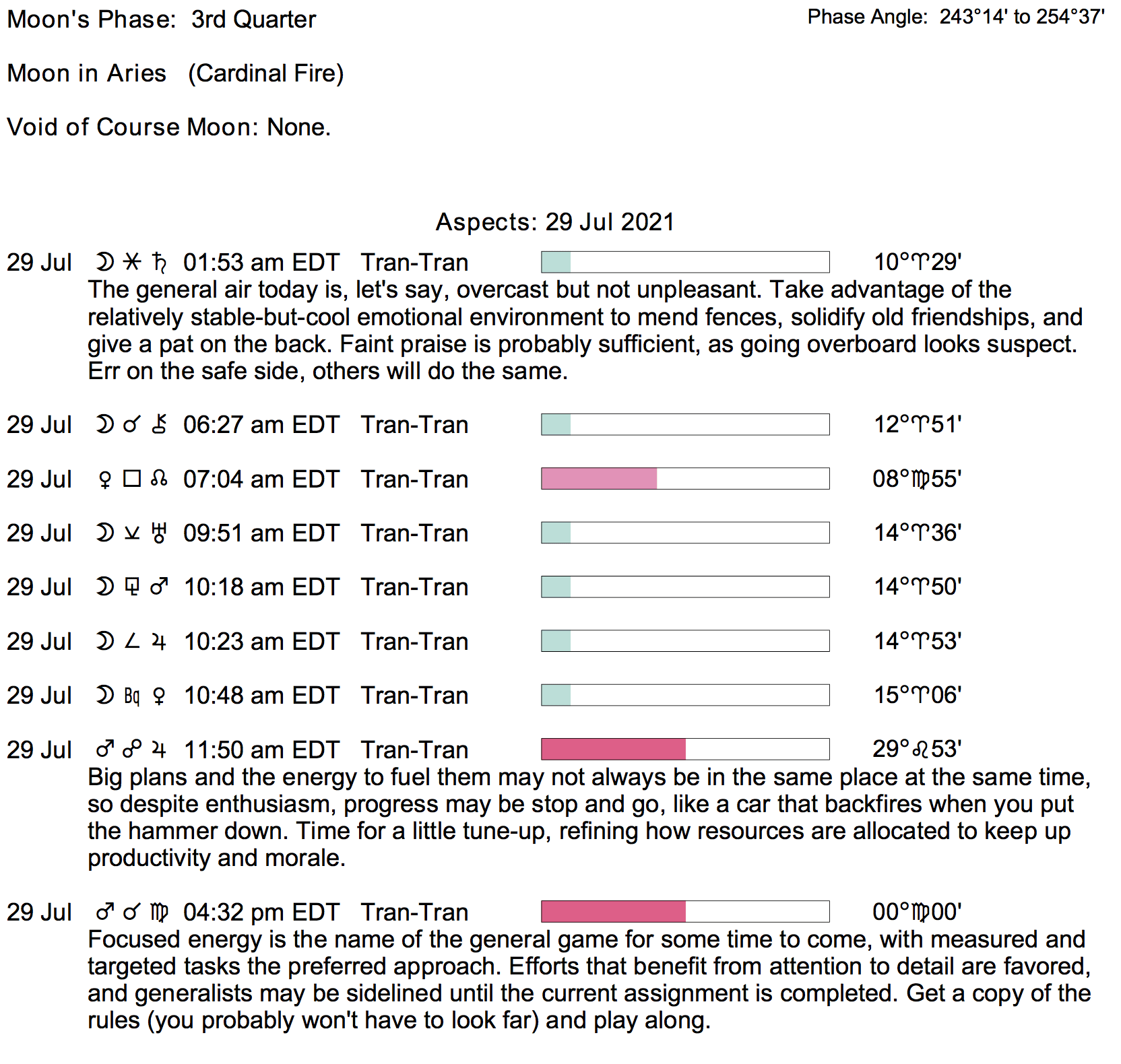 Planet Color Key: The longer the bar, the slower the aspecting planet, and the longer the duration of the planet’s transit.
