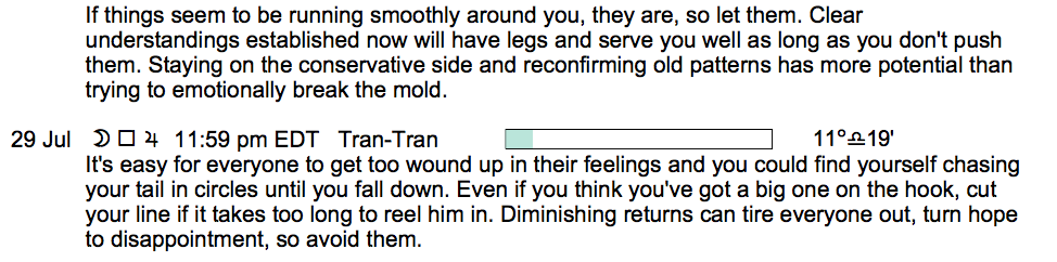 Planet Color Key: The longer the bar, the slower the aspecting planet, and the longer the duration of the planet’s transit.