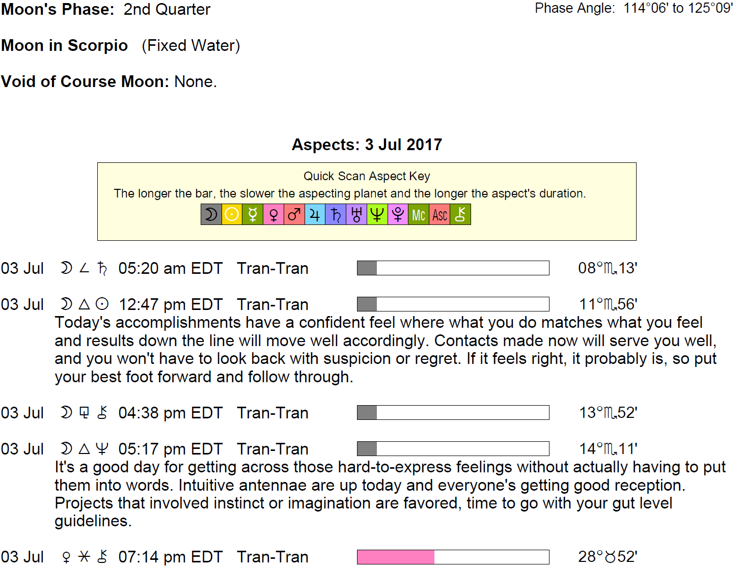 Note that the Moon moves at a rate of approximately one degree every 2 hours, so that if an aspect involving the Moon is applying and has an orb of 5 degrees, the aspect will perfect (be exact) in about 10 hours. If the Moon is separating from an aspect with an orb of 2 degrees, it has already formed said aspect approximately 4 hours ago (since the following are positions at noon today, then it would have occurred at about 8 AM today).