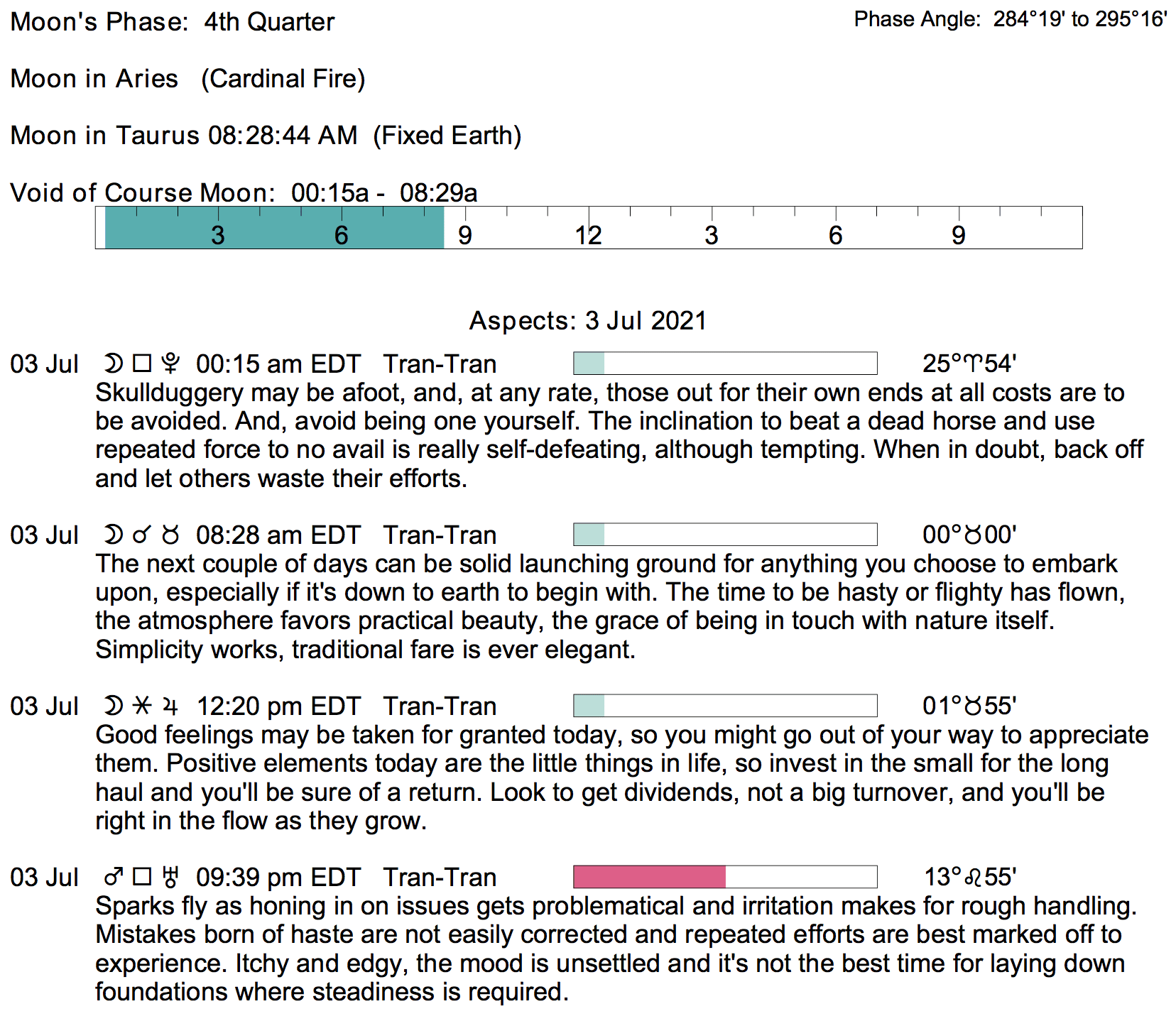 Planet Color Key: The longer the bar, the slower the aspecting planet, and the longer the duration of the planet’s transit.
