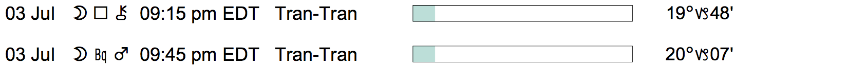 Planet Color Key: The longer the bar, the slower the aspecting planet, and the longer the duration of the planet’s transit.