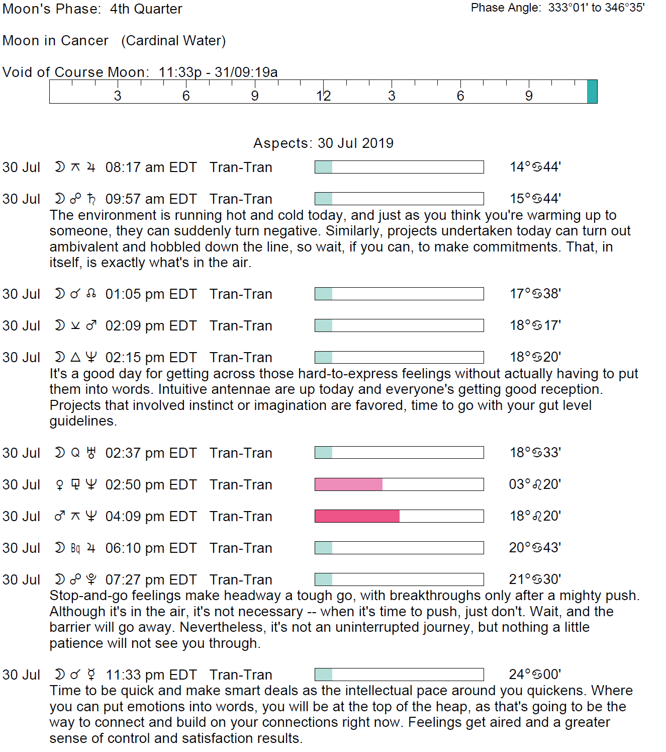 Planet Color Key: The longer the bar, the slower the aspecting planet and the longer the duration of the planet’s transit.