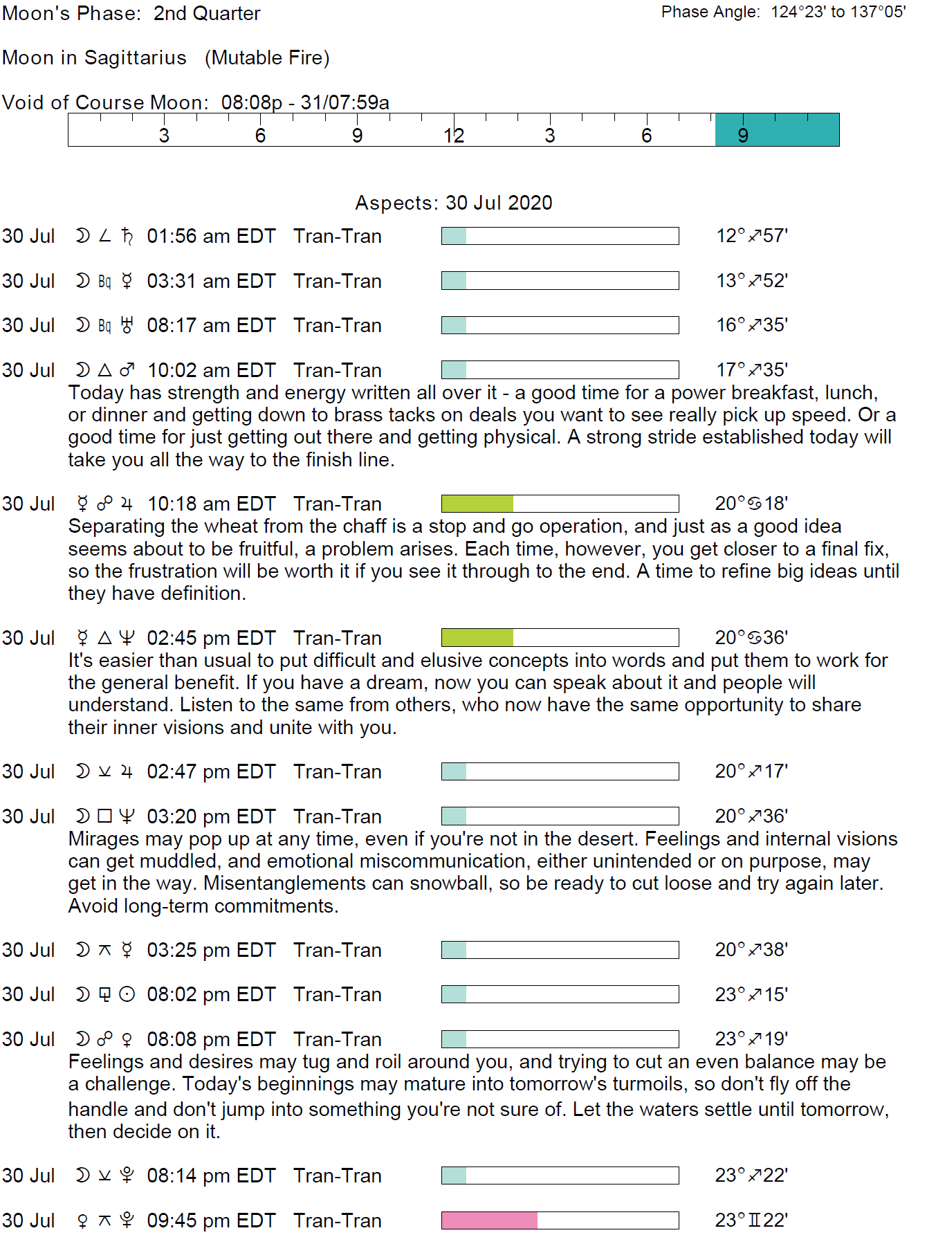 Planet Color Key: The longer the bar, the slower the aspecting planet and the longer the duration of the planet’s transit.