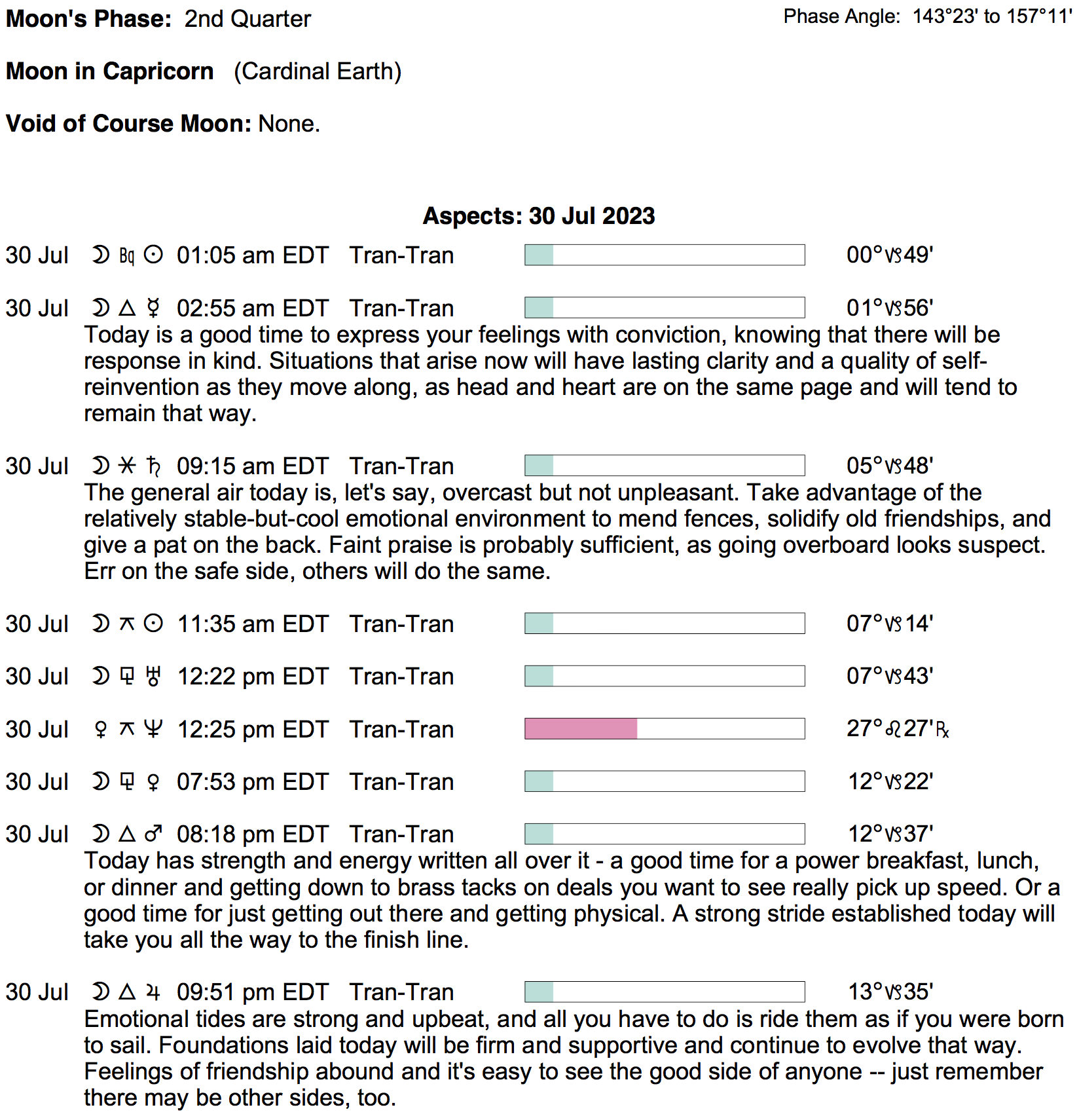 Planet Color Key: The longer the bar, the slower the aspecting planet, and the longer the duration of the planet’s transit.