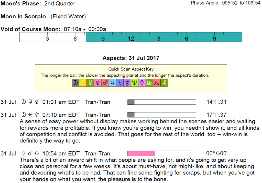 **I suggest paying close attention to applying aspects. The energy of the aspect builds as it gets closer to exact. Once an aspect involving inner planets has happened, it’s over. Separating aspects are good to know for context, but in terms of energy that is with us today, applying aspects are most important. (This is the case for daily astrology influences involving inner planets, which pass quickly, and not natal astrology aspects, which are with us for a lifetime).