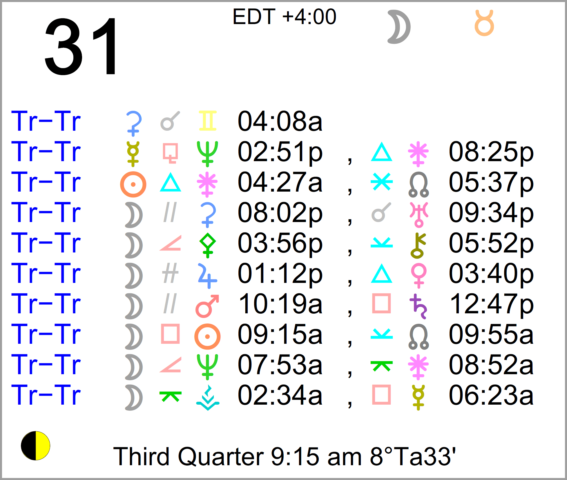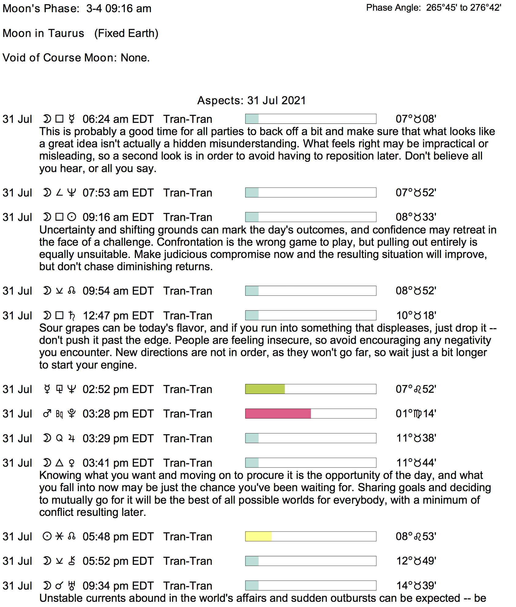 Planet Color Key: The longer the bar, the slower the aspecting planet, and the longer the duration of the planet’s transit.