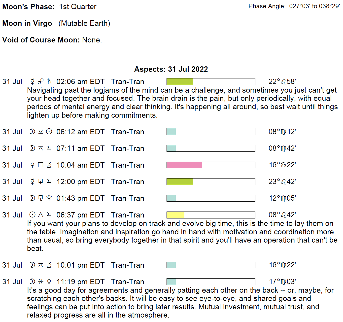 Planet Color Key: The longer the bar, the slower the aspecting planet, and the longer the duration of the planet’s transit.