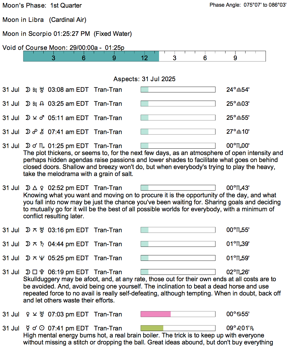 Planet Color Key: The longer the bar, the slower the aspecting planet, and the longer the duration of the planet’s transit.