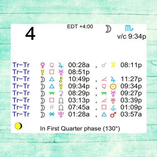 - The Moon is void from 9:34 PM forward (until tomorrow at 1:07 AM).