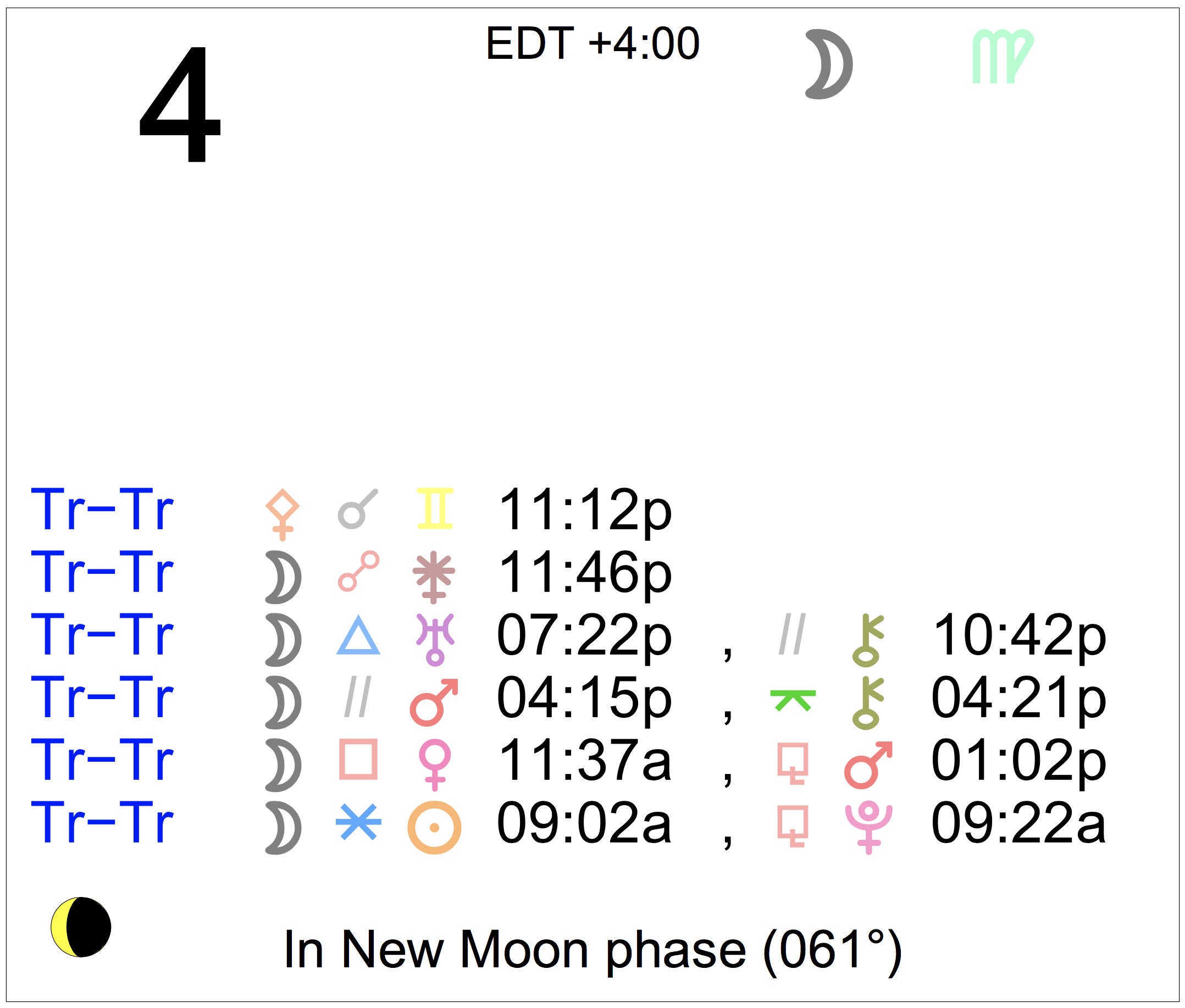 Planet Color Key: The longer the bar, the slower the aspecting planet, and the longer the duration of the planet’s transit.