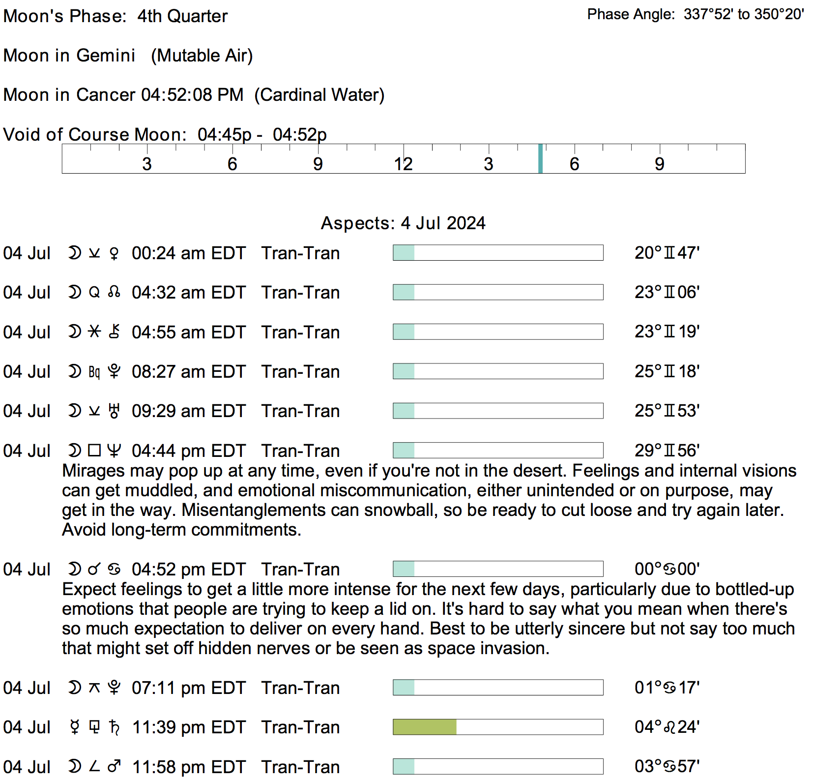 - The Moon is in Gemini until 4:51 PM, from which time the Moon is in Cancer.