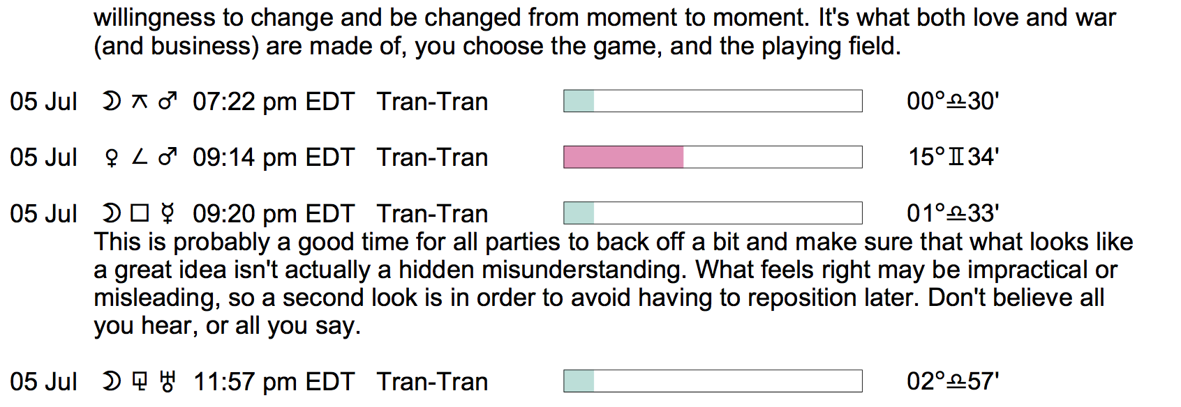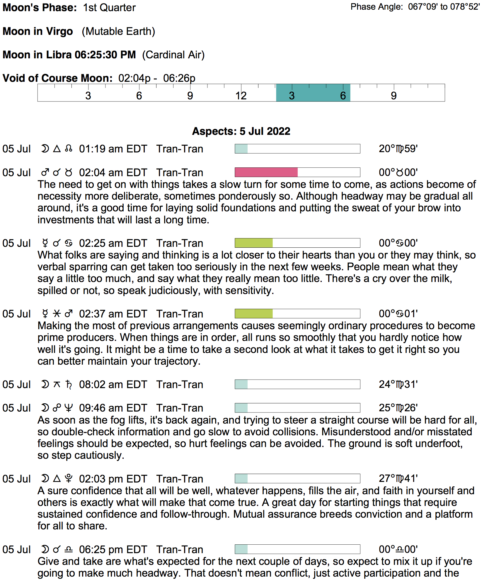 Planet Color Key: The longer the bar, the slower the aspecting planet, and the longer the duration of the planet’s transit.