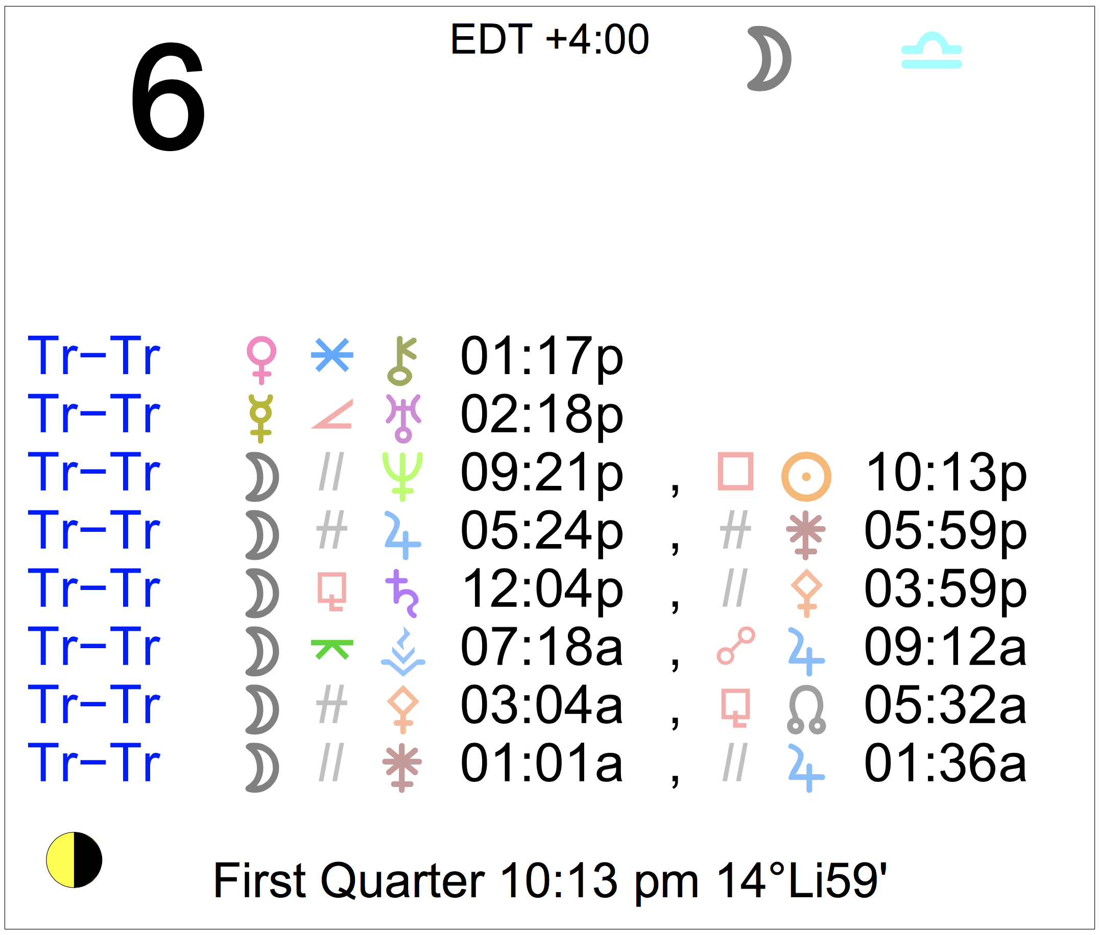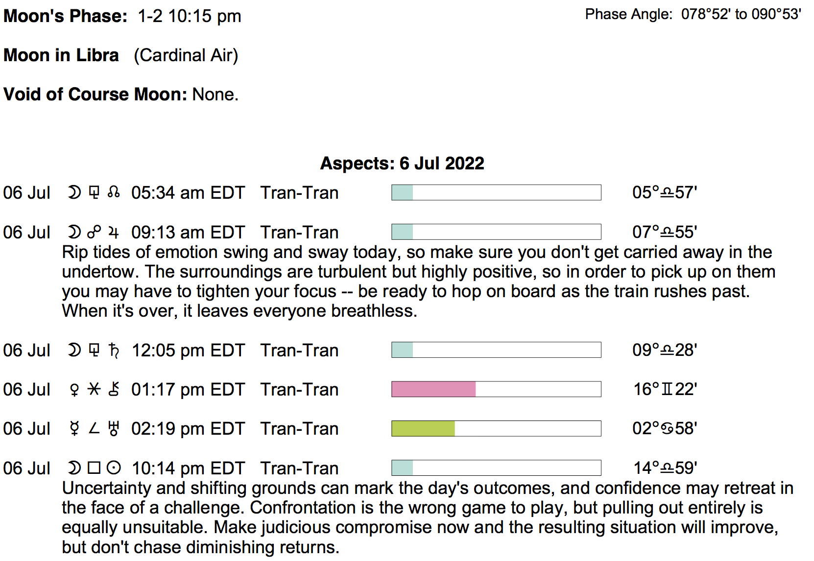 Planet Color Key: The longer the bar, the slower the aspecting planet, and the longer the duration of the planet’s transit.