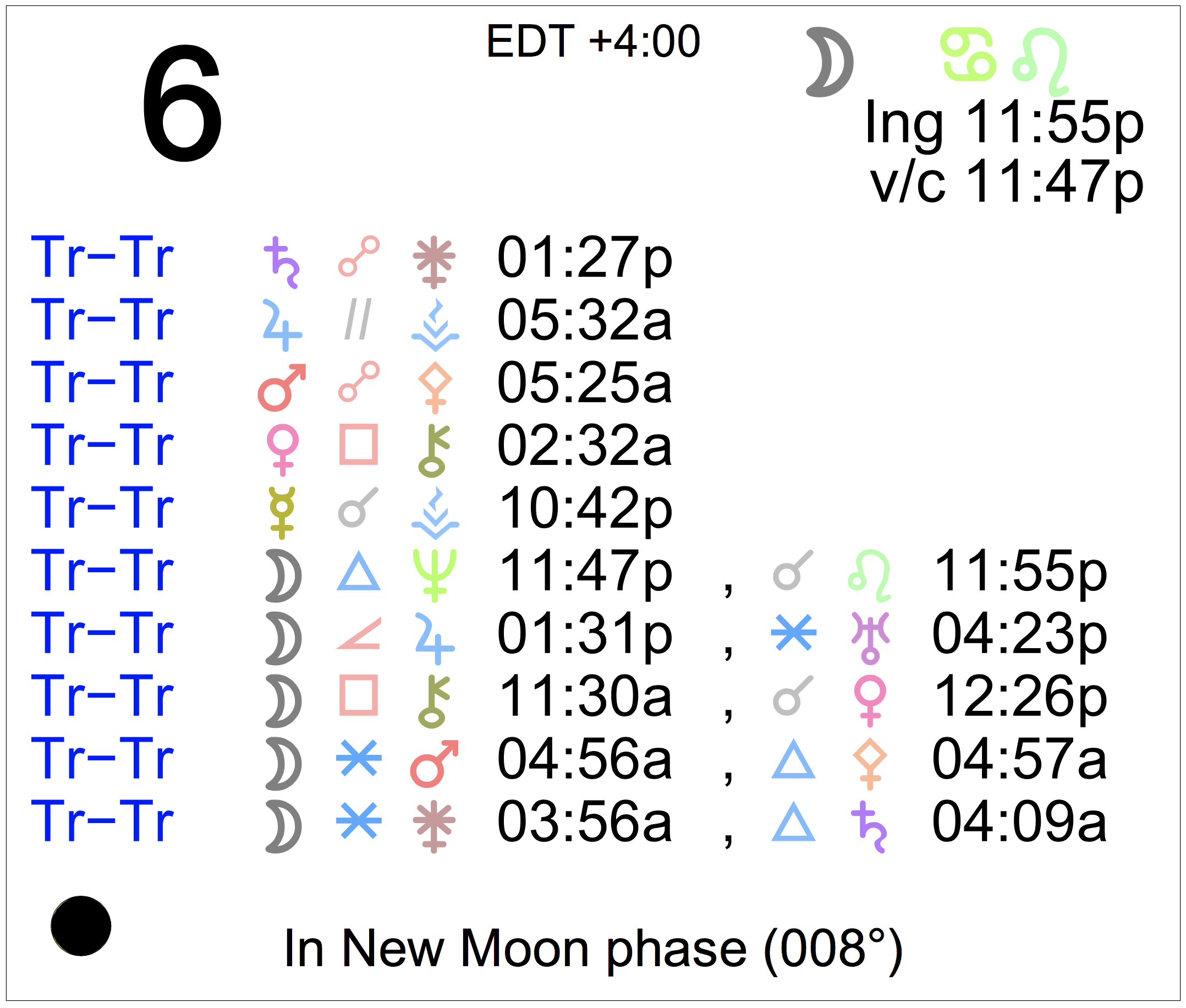 - The Moon is in Cancer most of the day, until 11:55 PM, from which time the Moon is in Leo.