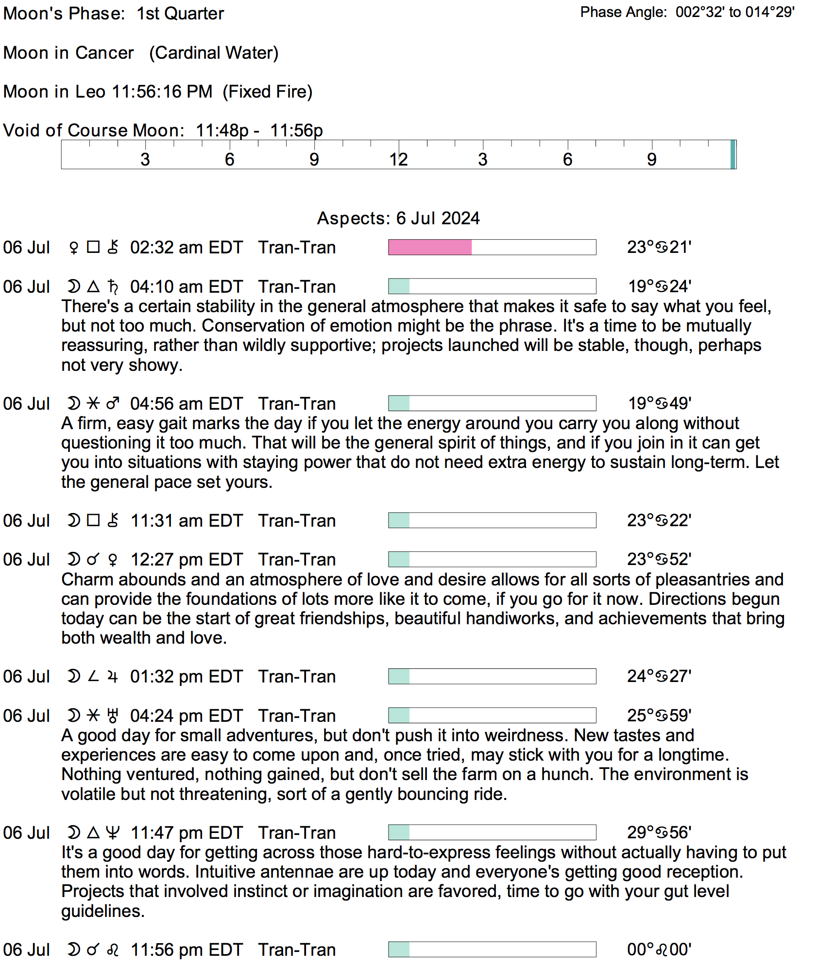 Planet Color Key: The longer the bar, the slower the aspecting planet, and the longer the duration of the planet’s transit.
