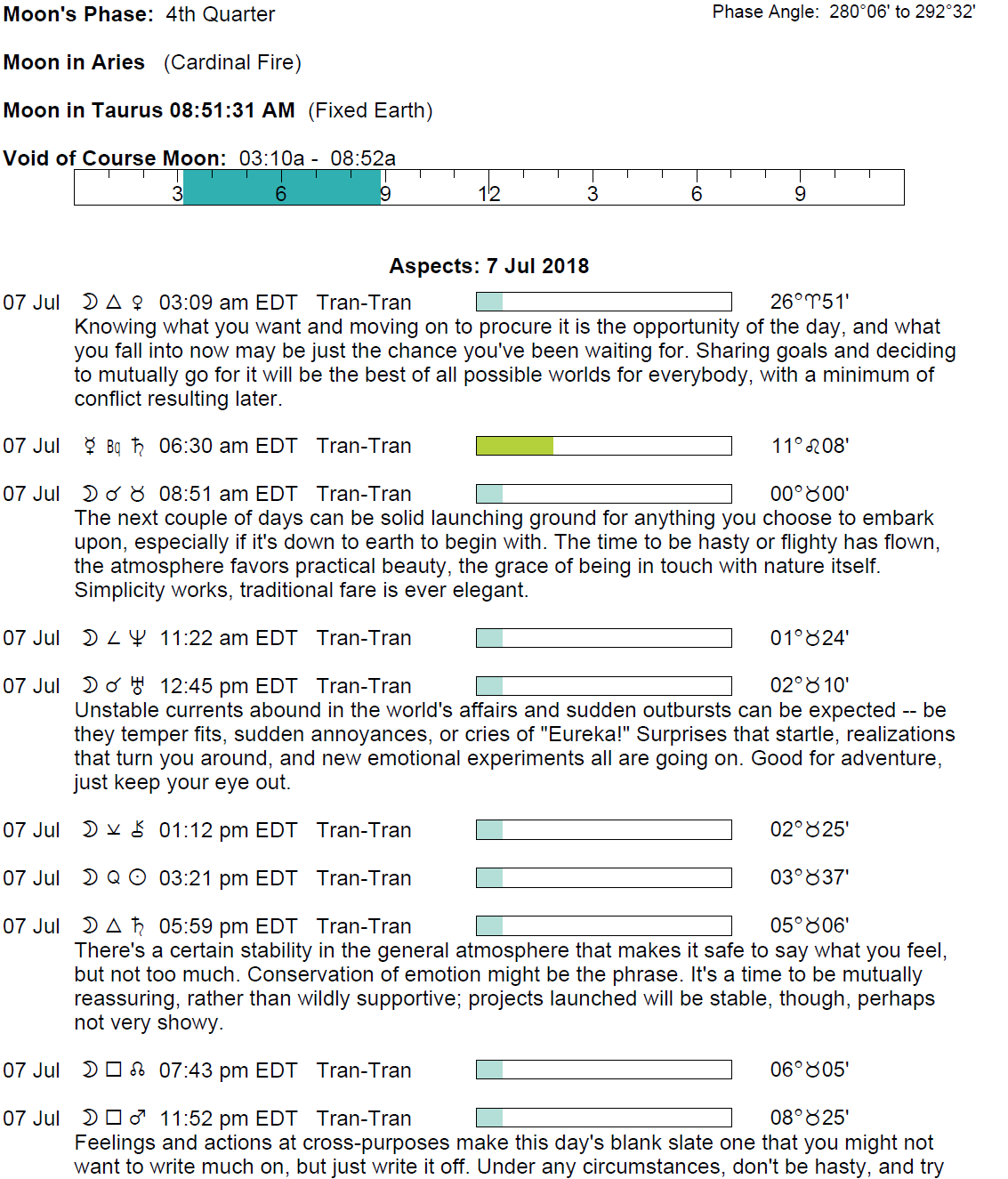 Planet Color Key: The longer the bar, the slower the aspecting planet and the longer the duration of the planet’s transit.
