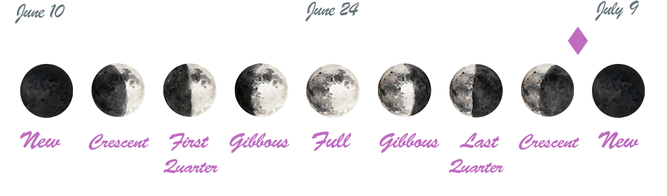 A list of lunar phases dates starting at the New Moon on June 10th, 2021