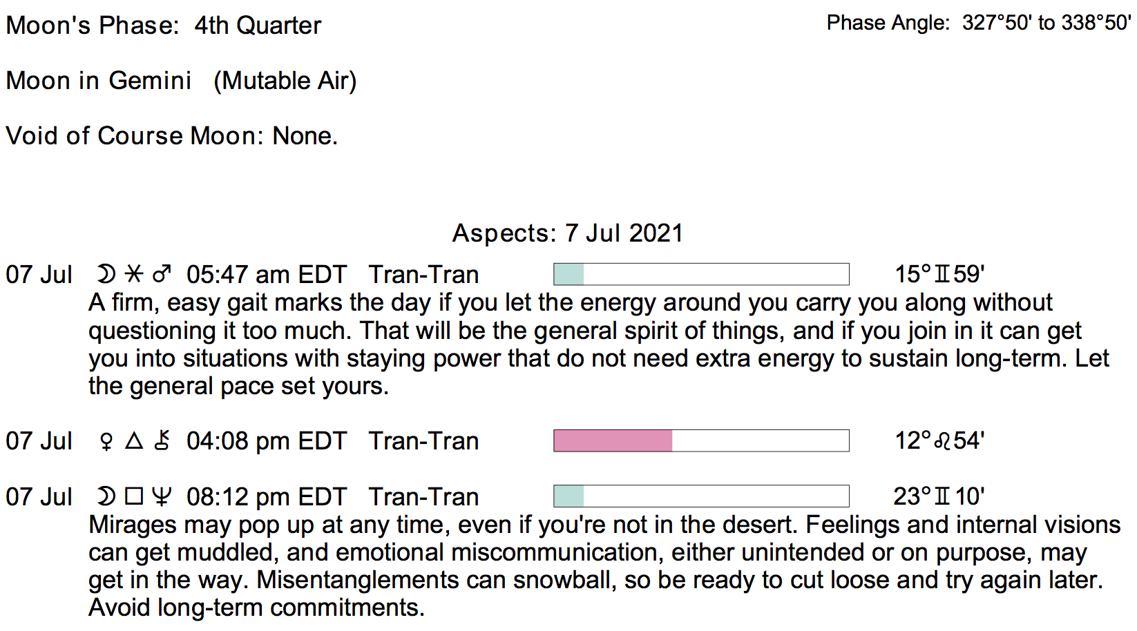 Planet Color Key: The longer the bar, the slower the aspecting planet, and the longer the duration of the planet’s transit.