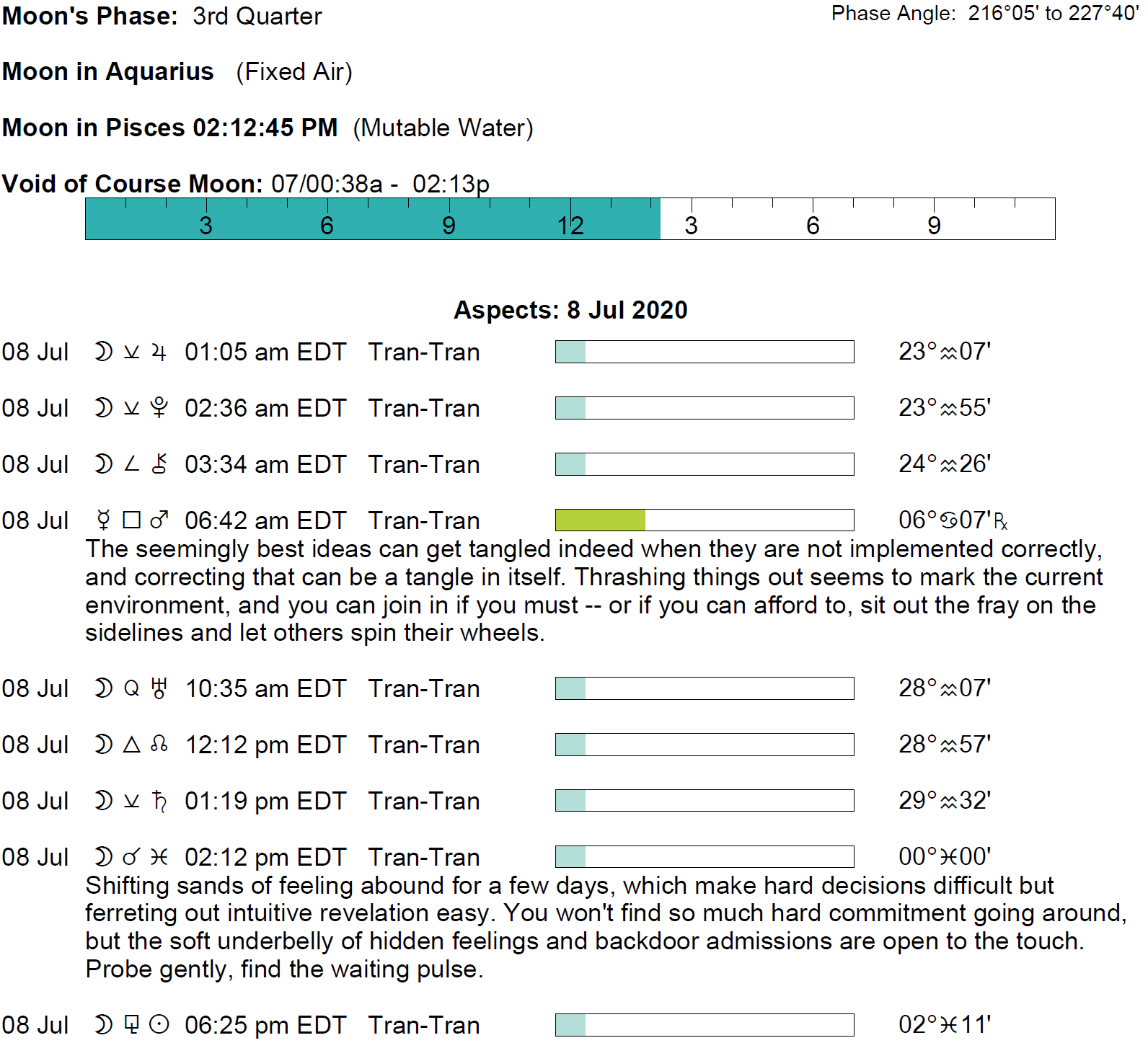 - The void Moon period continues until 2:12 PM (continuing from yesterday at 12:37 AM– a rather lengthy void period).