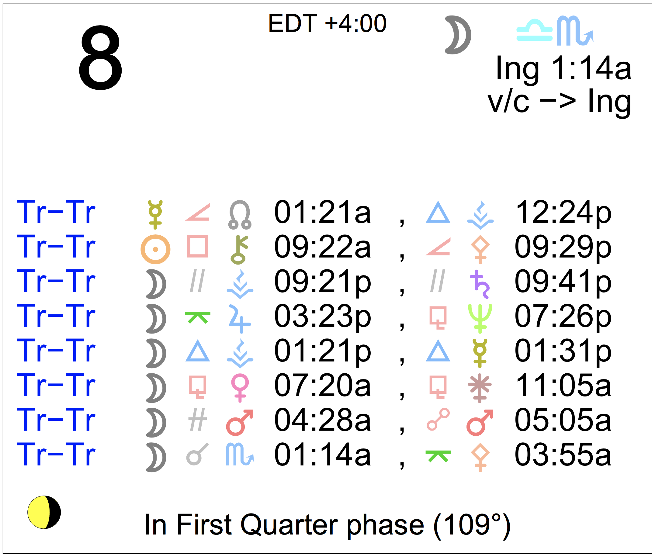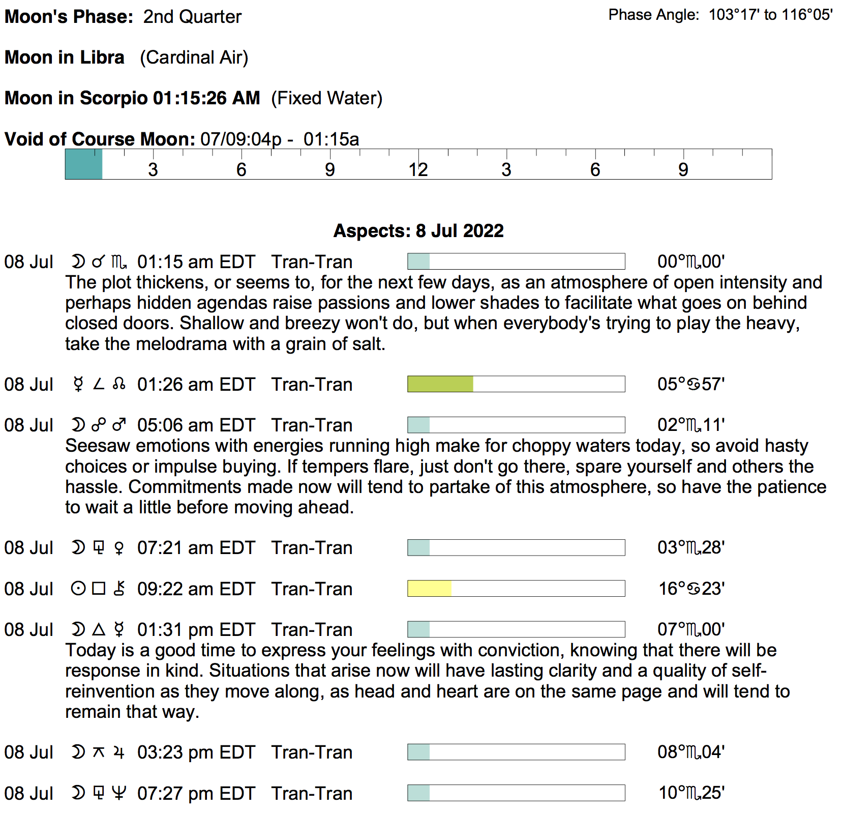 Planet Color Key: The longer the bar, the slower the aspecting planet, and the longer the duration of the planet’s transit.