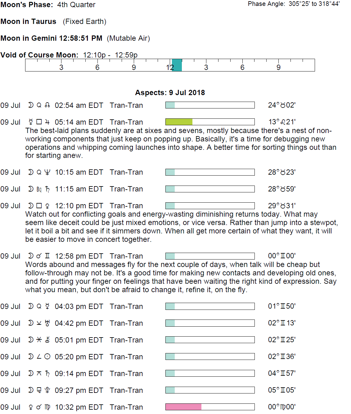Planet Color Key: The longer the bar, the slower the aspecting planet and the longer the duration of the planet’s transit.