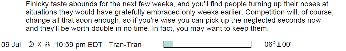 Romantic matters can be unsettled, or we can be a little insecure in our relationships. It can be difficult to show restraint. An indulgent, moody time. Hypersensitivity.