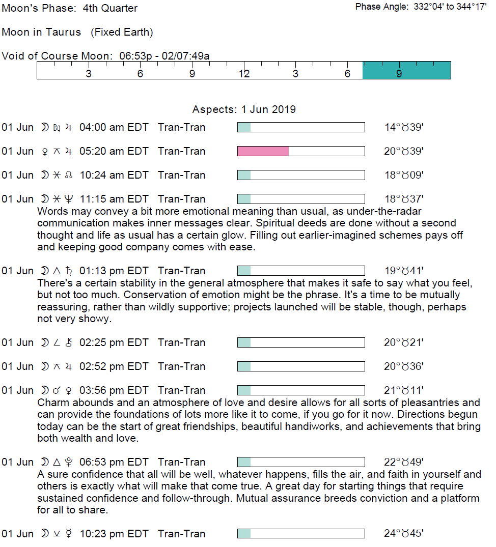 Planet Color Key: The longer the bar, the slower the aspecting planet and the longer the duration of the planet’s transit.