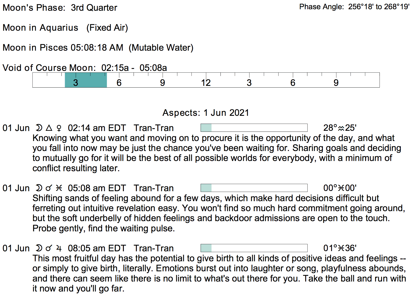 - The Moon continues its transit of Aquarius until 5:07 AM, after which the Moon is in Pisces.