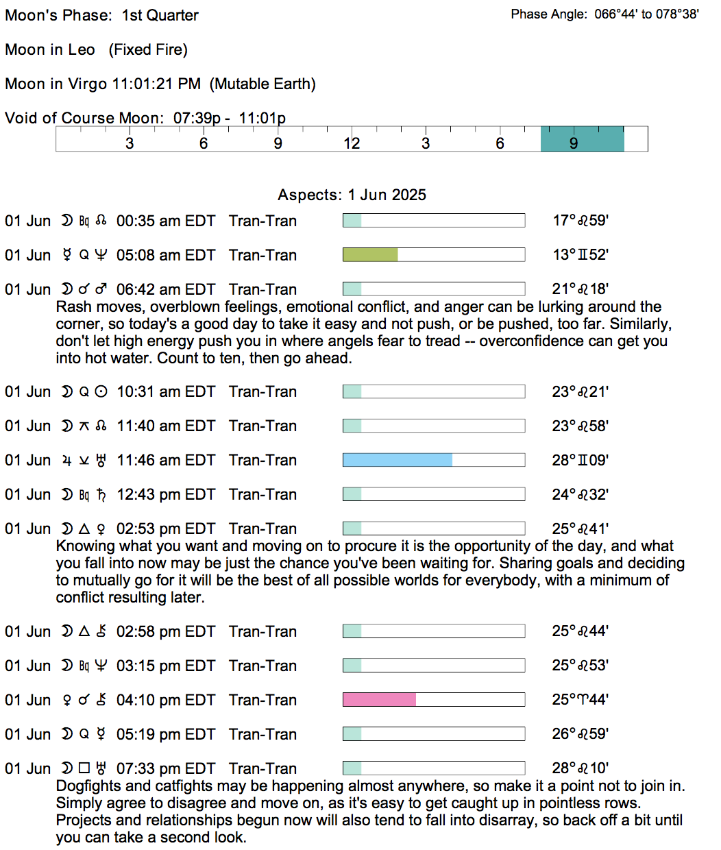 Planet Color Key: The longer the bar, the slower the aspecting planet, and the longer the duration of the planet’s transit.