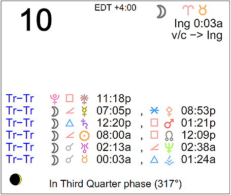 An auspicious time for any project demanding endurance or tolerance. Also good for establishing new habits and rituals.