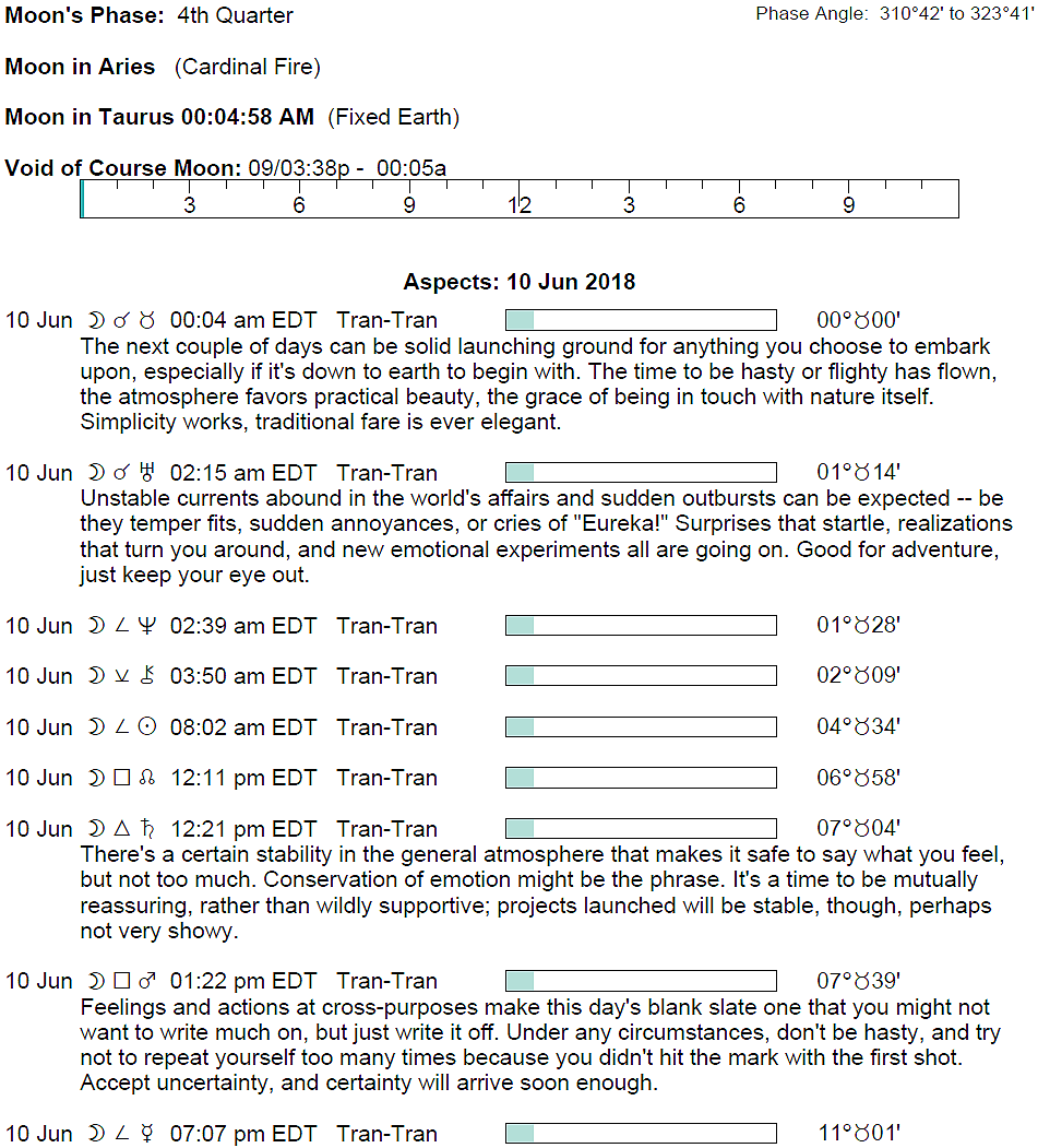 The following aspects (major only) and positions are at noon (EDT) on June 10th: