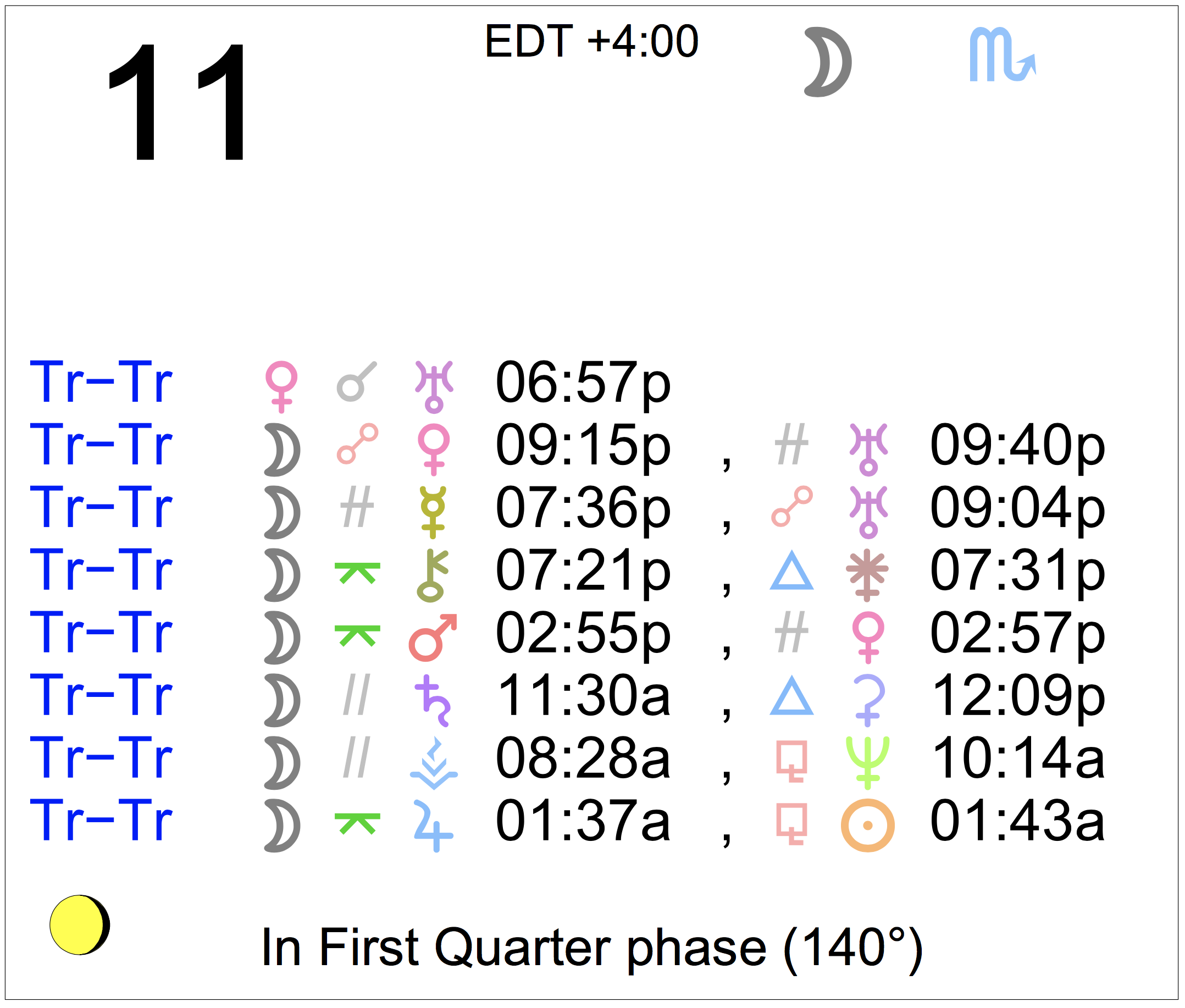 Planet Color Key: The longer the bar, the slower the aspecting planet, and the longer the duration of the planet’s transit.