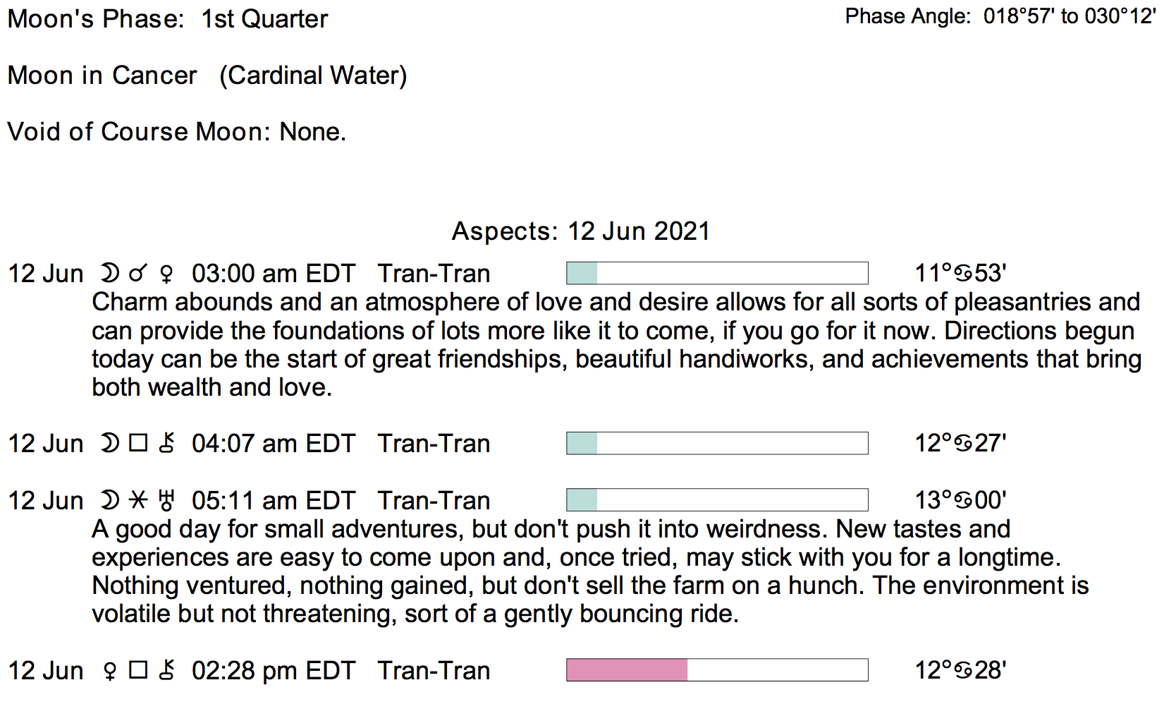 Planet Color Key: The longer the bar, the slower the aspecting planet, and the longer the duration of the planet’s transit.
