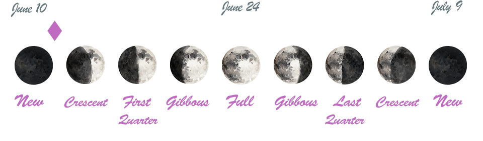 - A New Moon/Solar Eclipse occurred on the 10th in Gemini, and a First Quarter Moon will happen on June 17th.