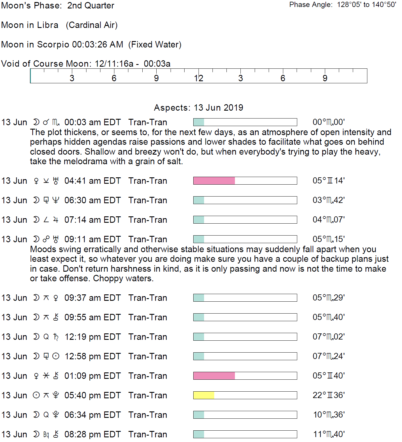 Planet Color Key: The longer the bar, the slower the aspecting planet and the longer the duration of the planet’s transit.